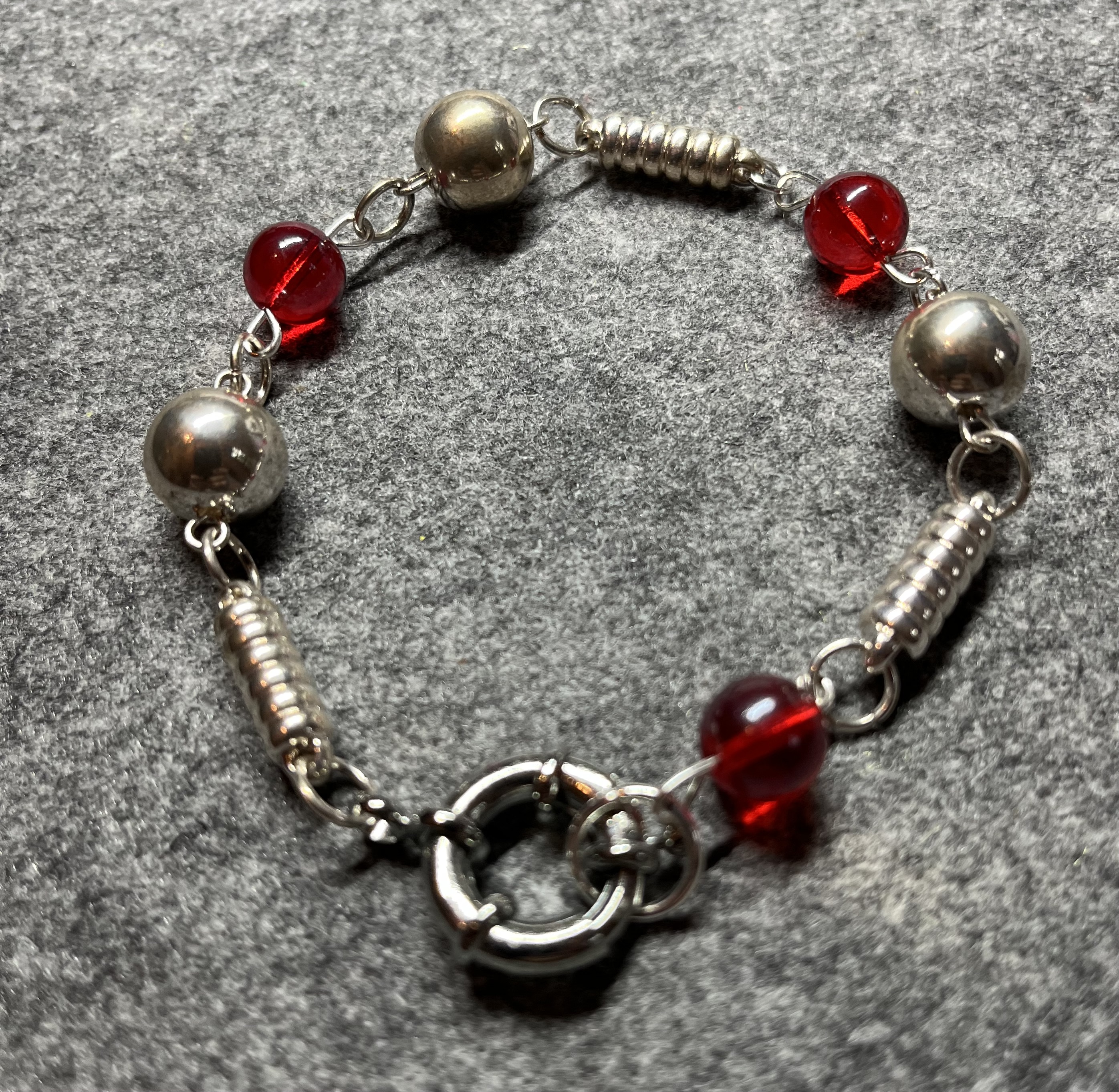 Armband Perlen- silberfarben, rot Glas (22cm) Karabinerverschluss