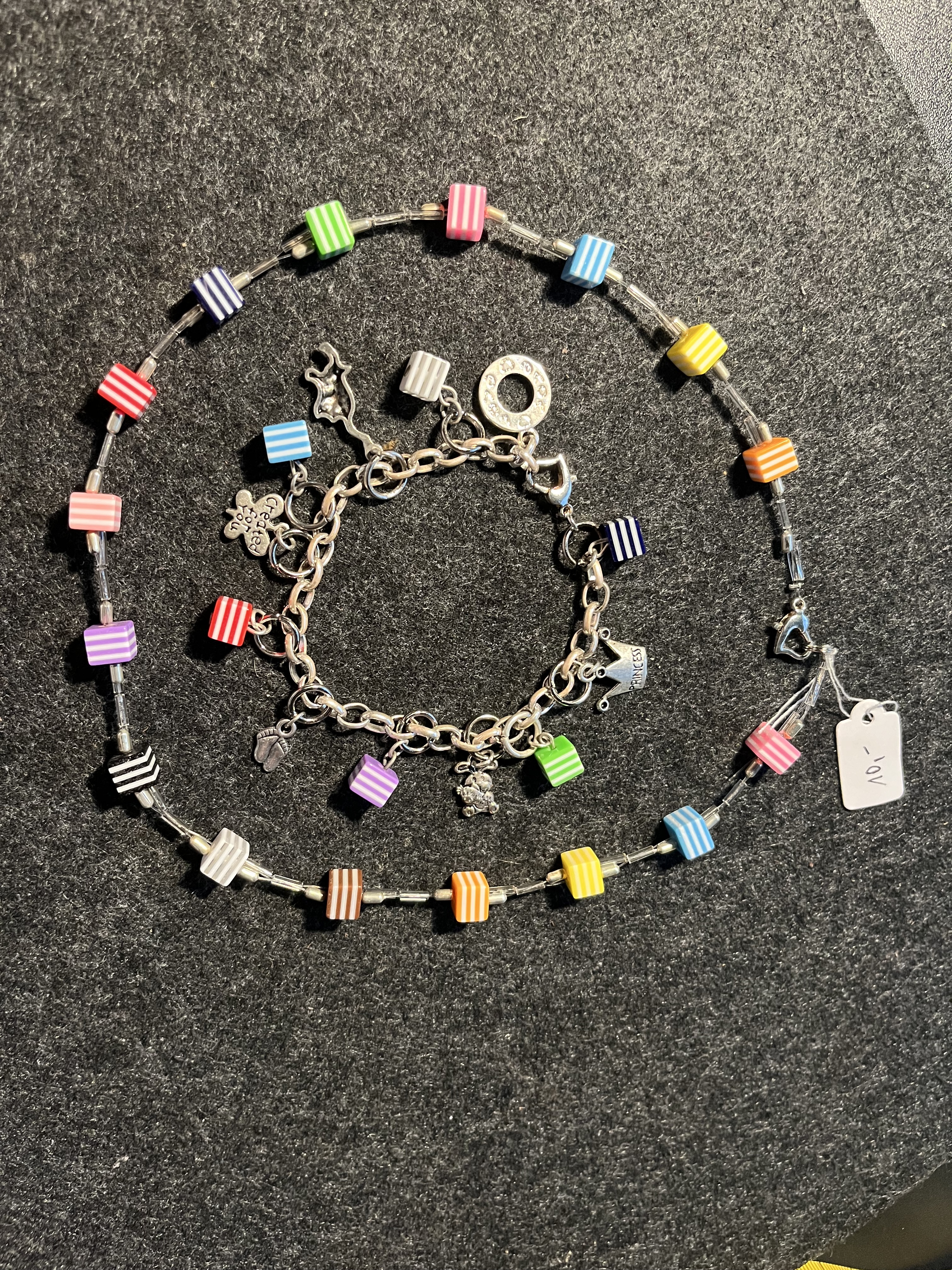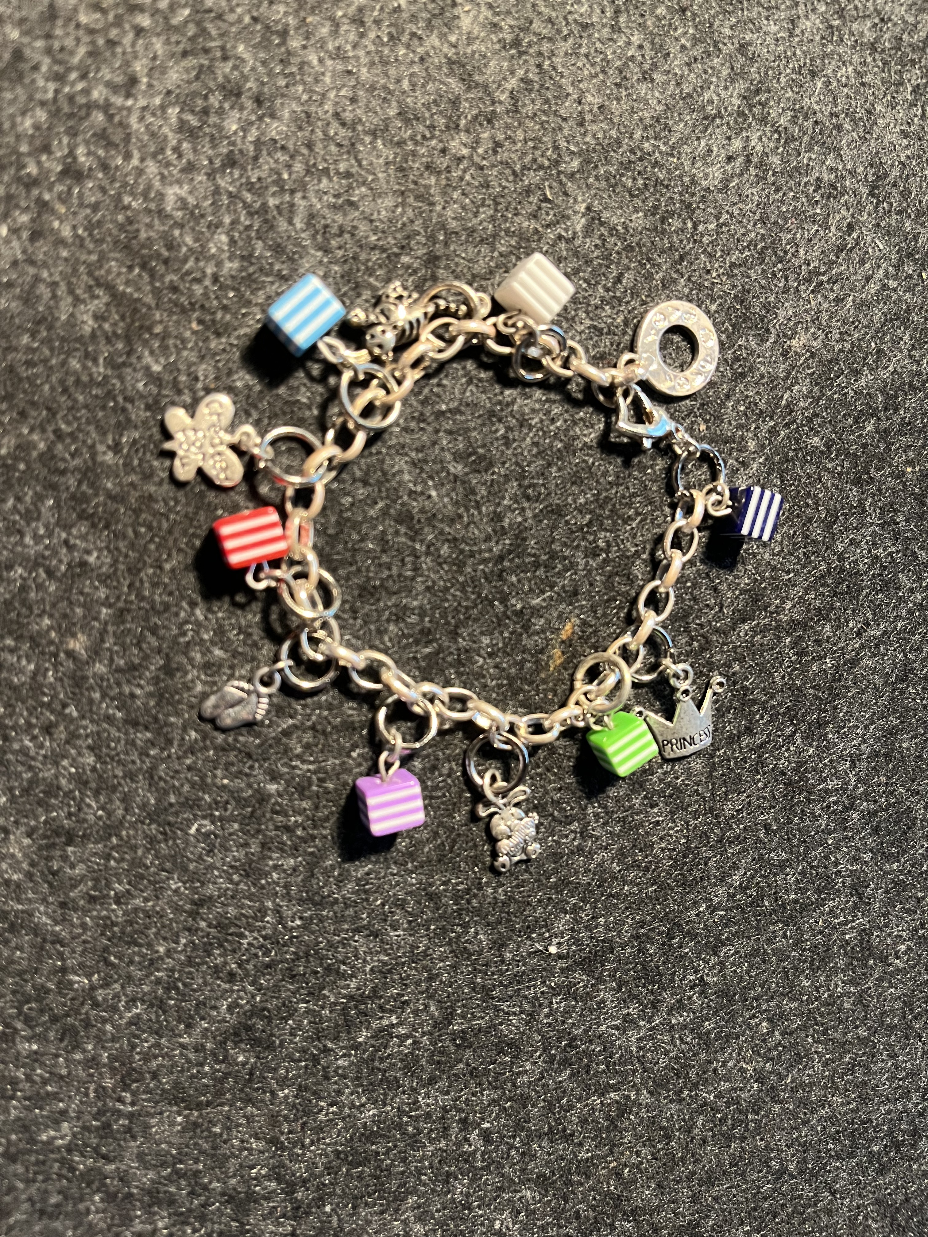 Das Armband hier ist versilbert und hat 6x kleine bunte Würfel