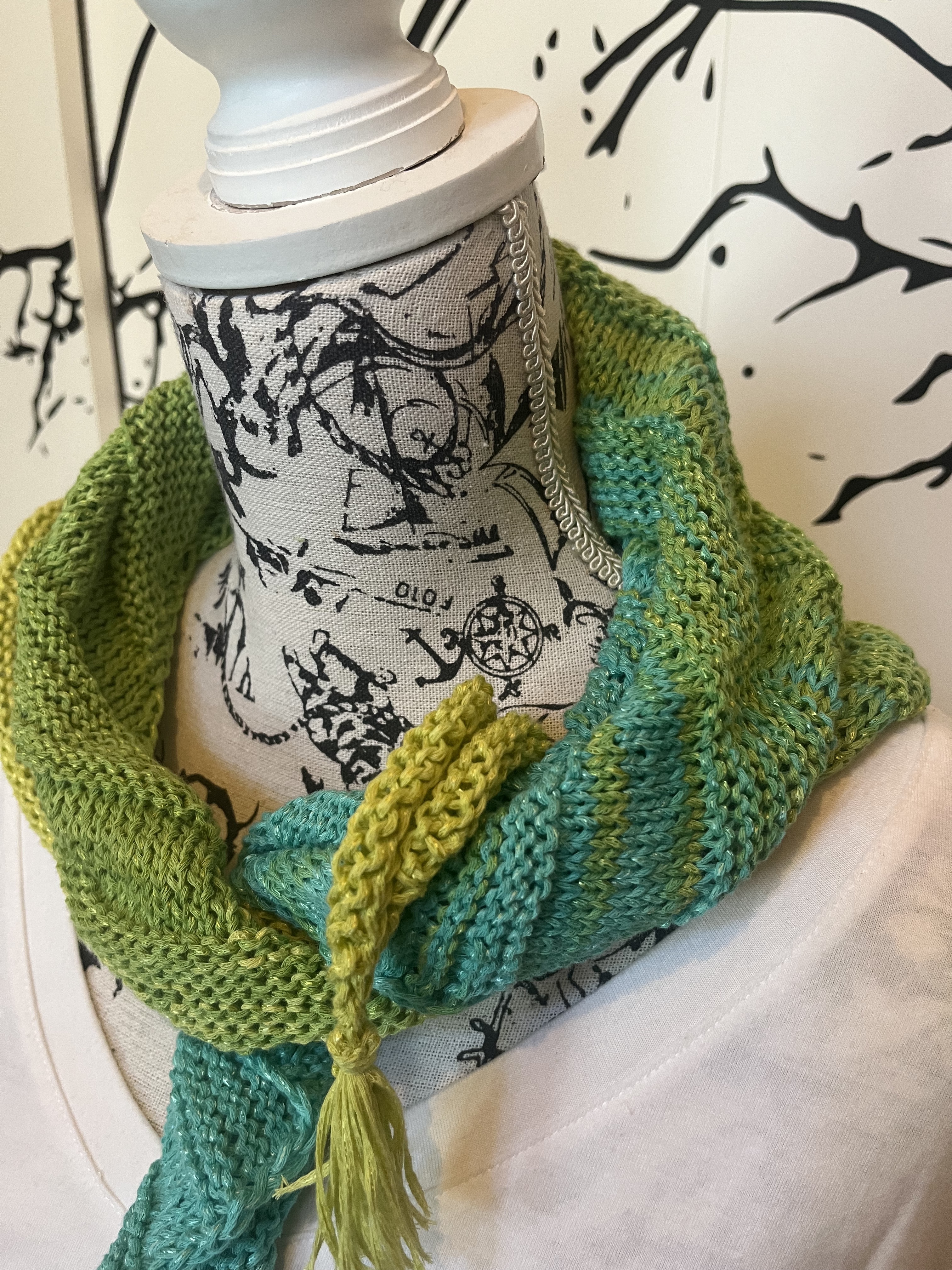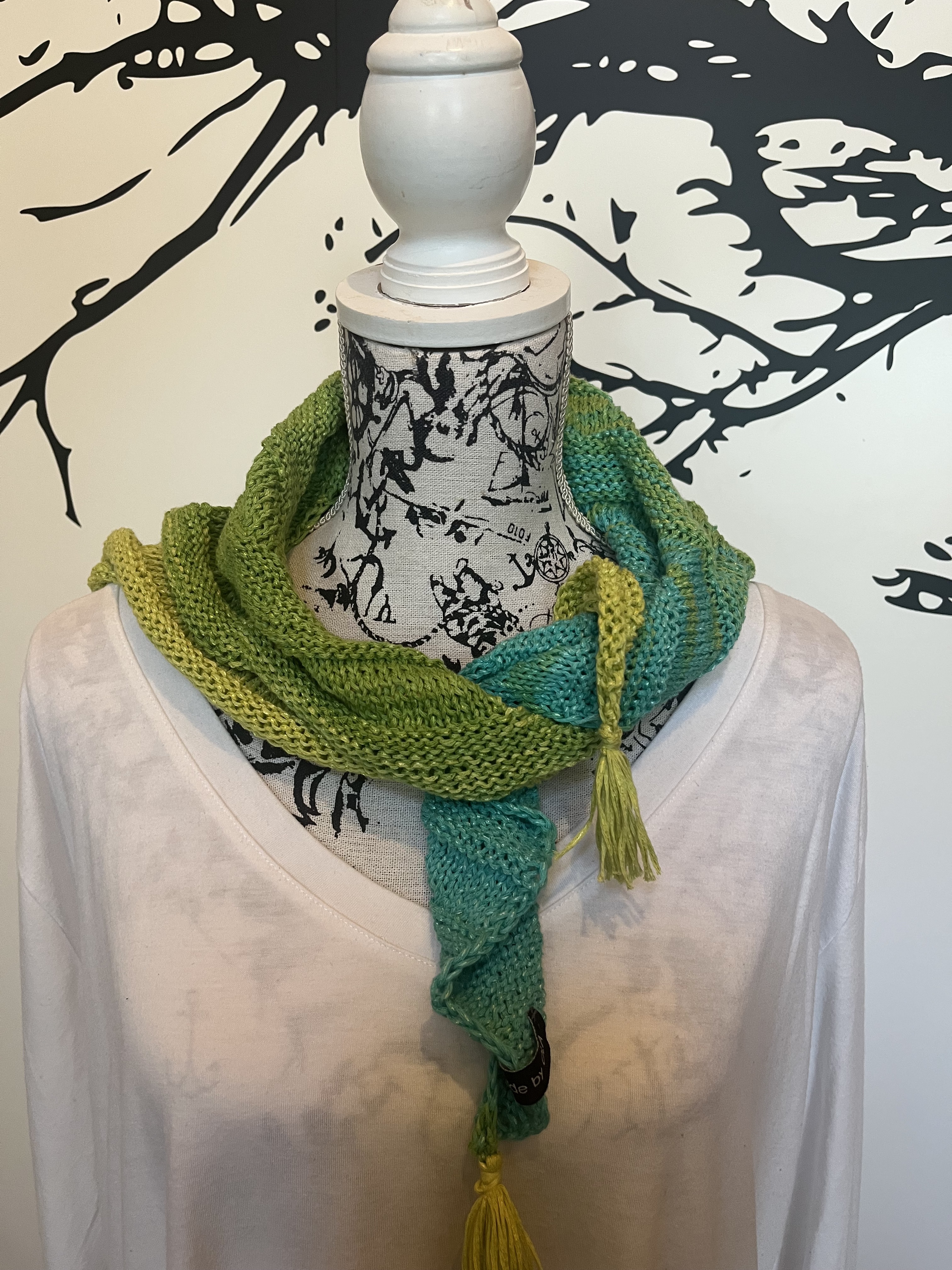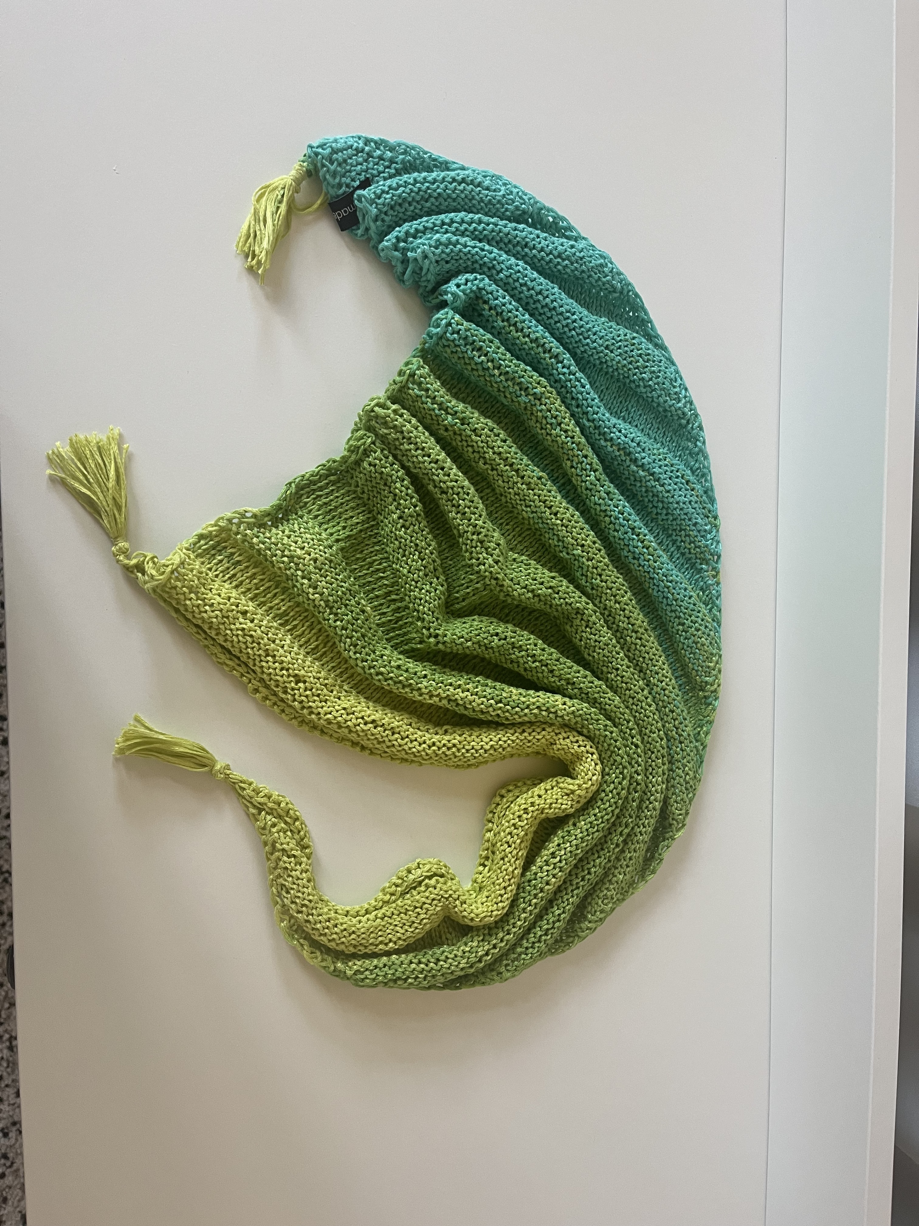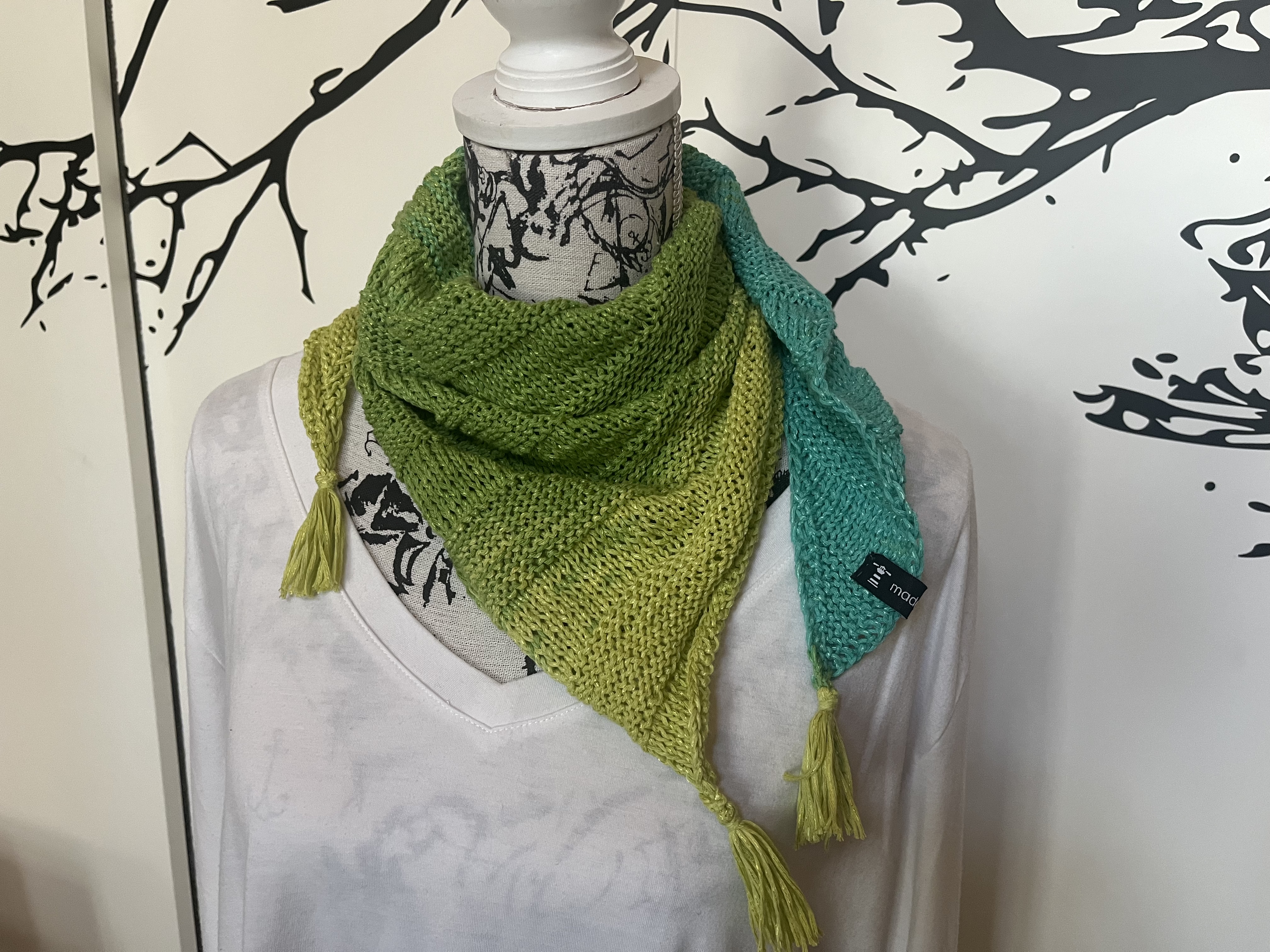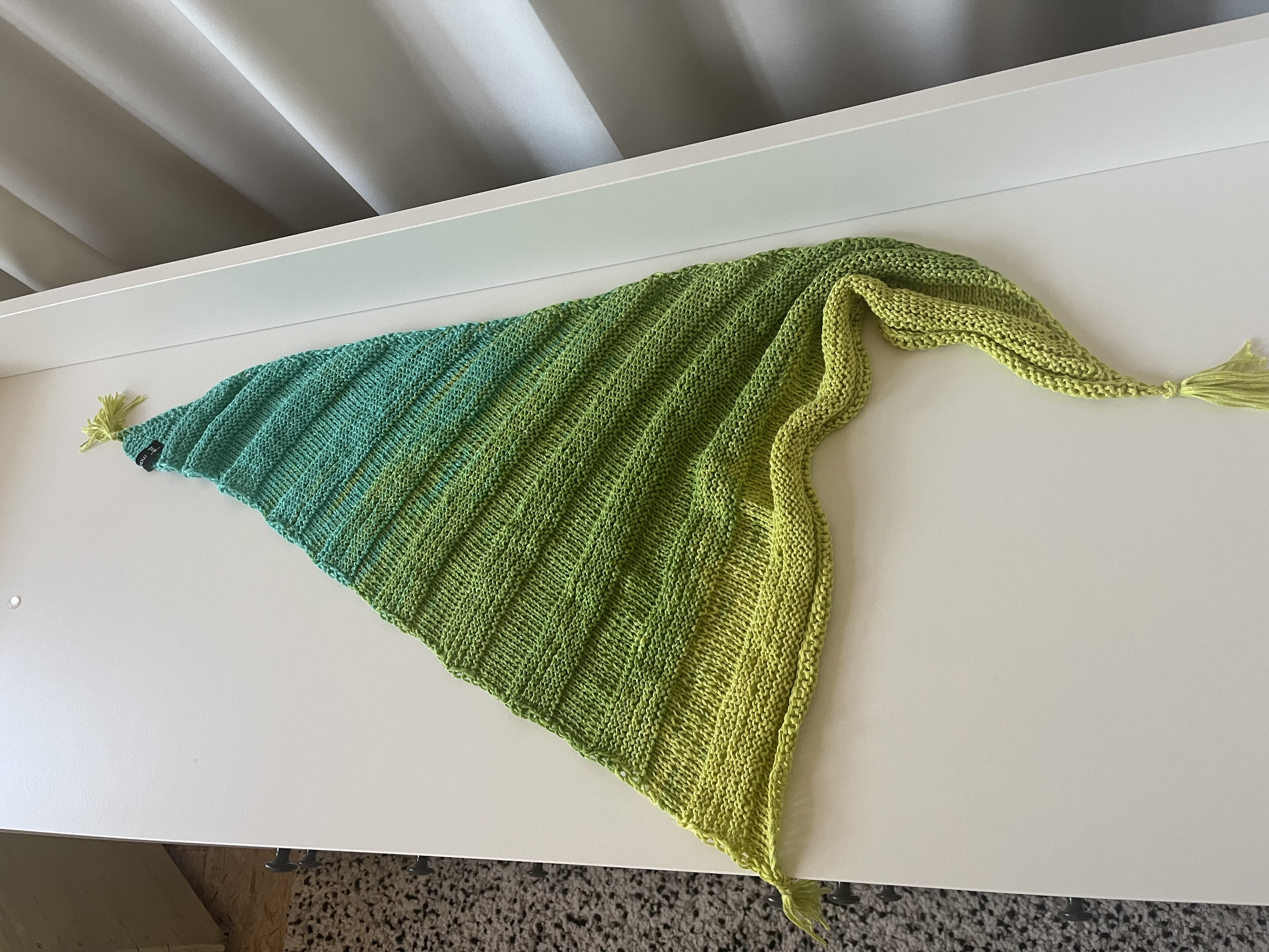 Hier habe ich aus einem Knäul Farbverlaufsgarn ein kleines Dreieckstuch für Kinder gestrickt .