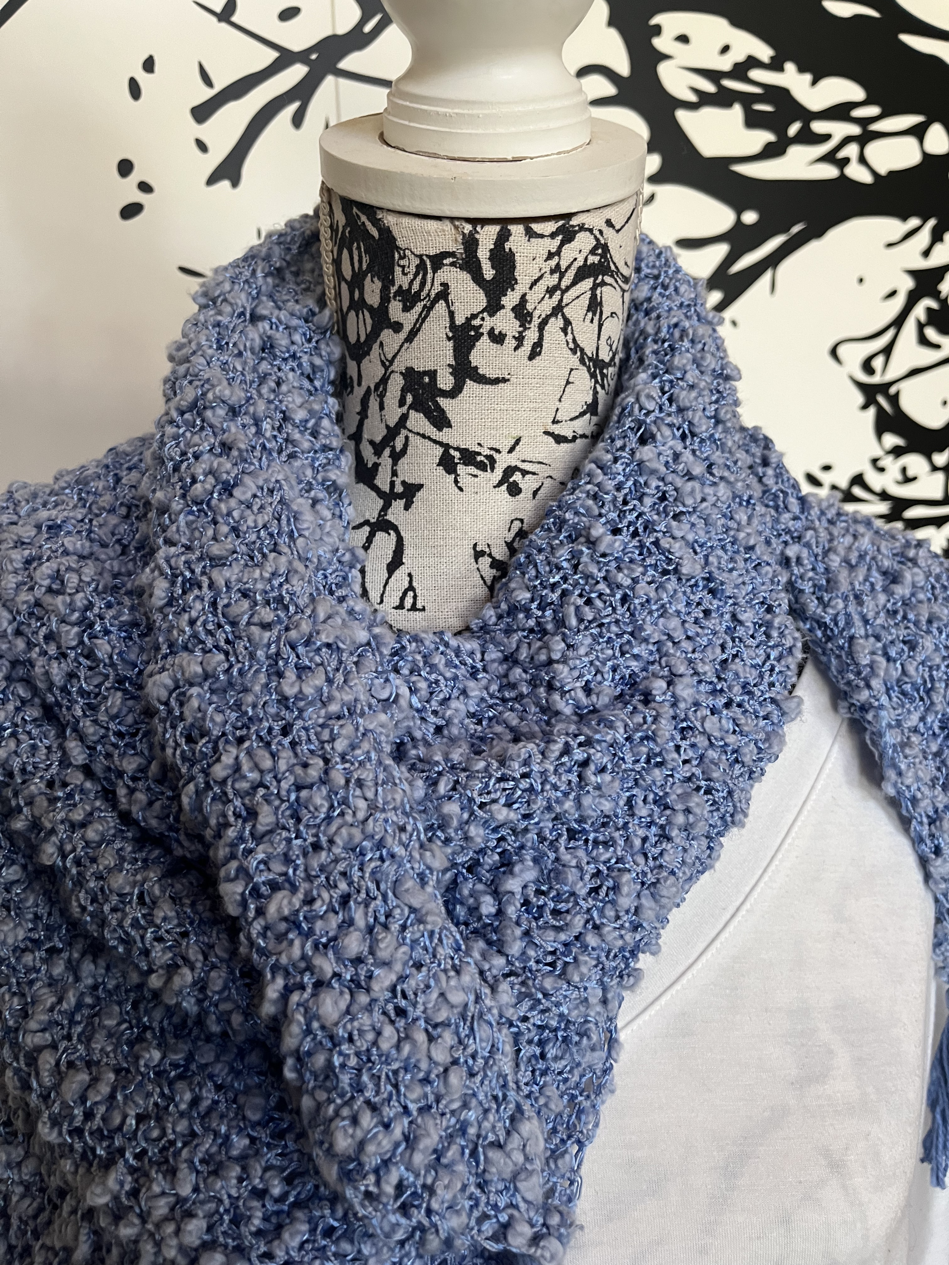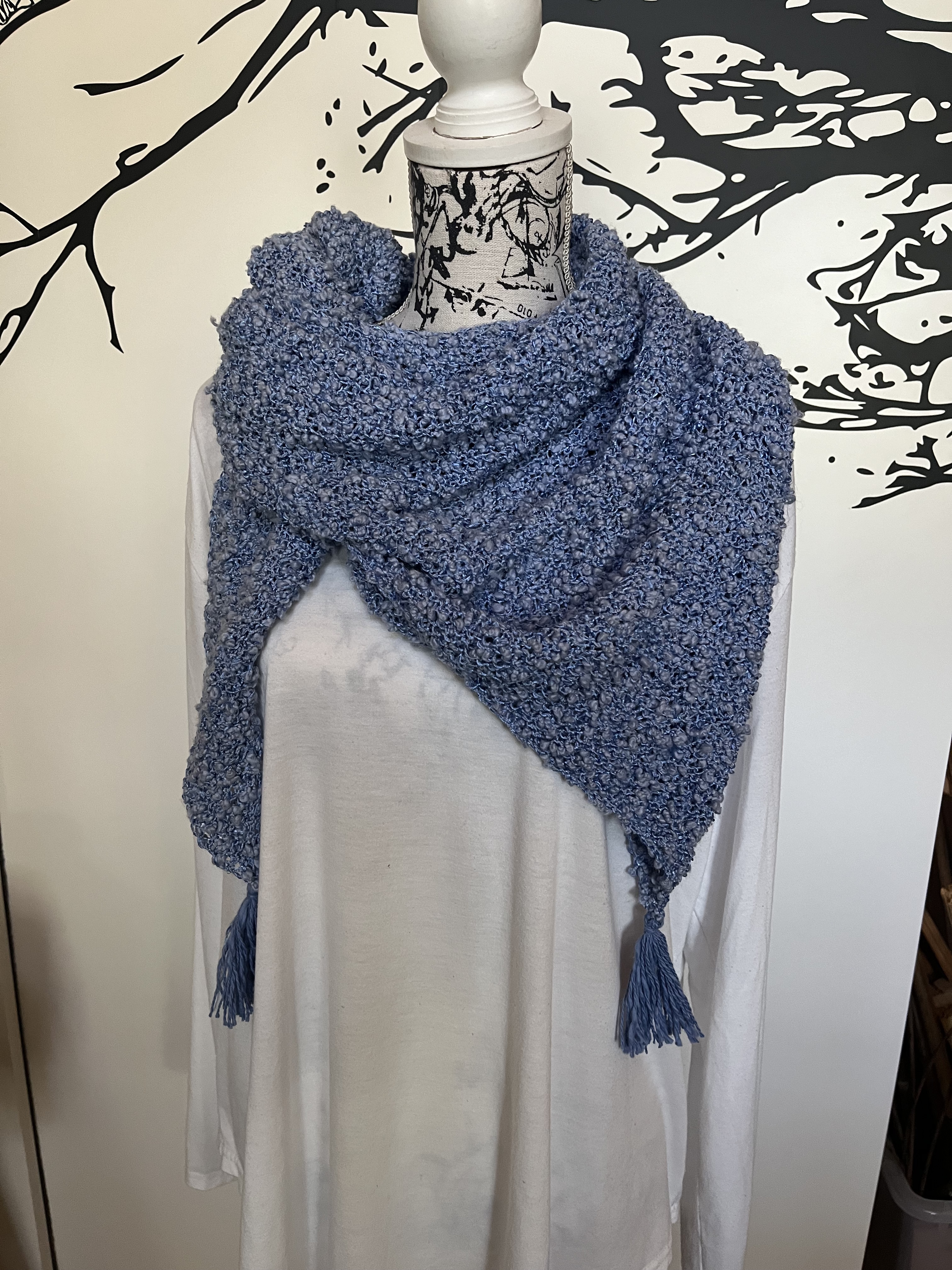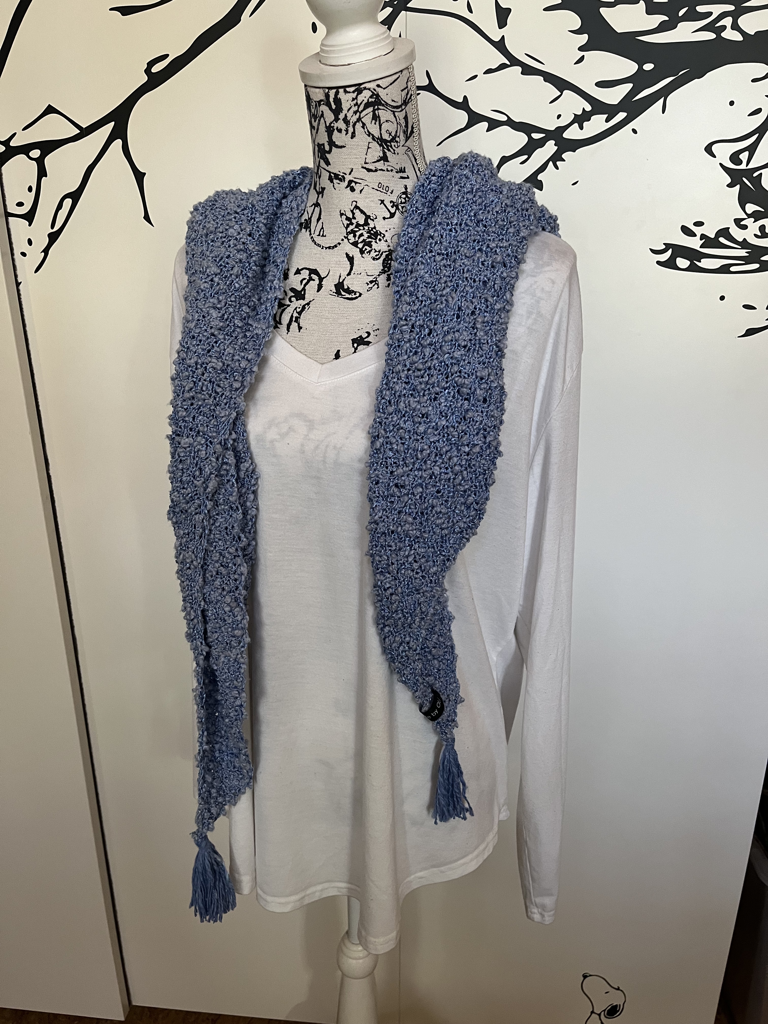 Hier habe ich aus weichem Knötchengarn ein schönes Dreieckstuch gestrickt .