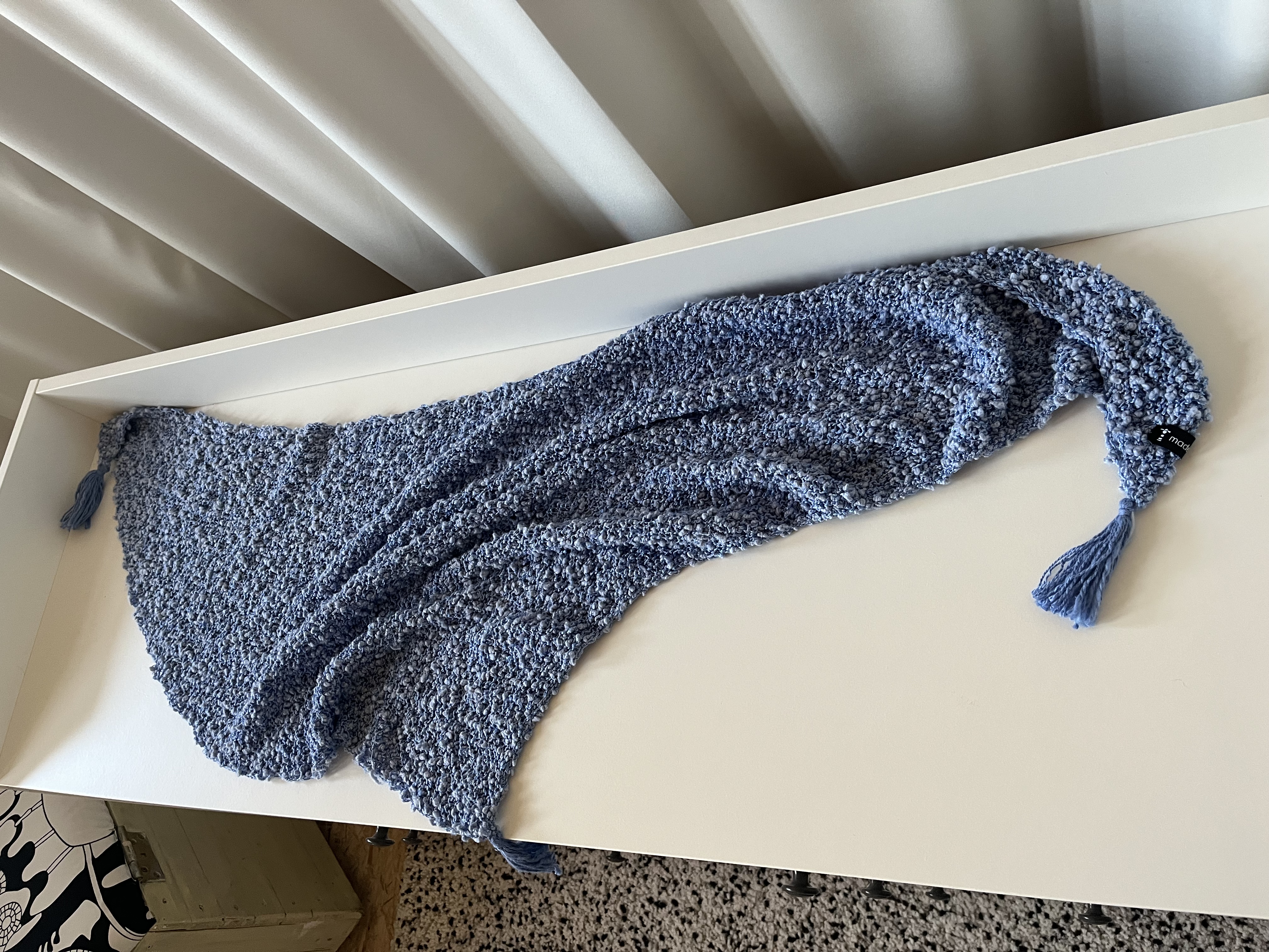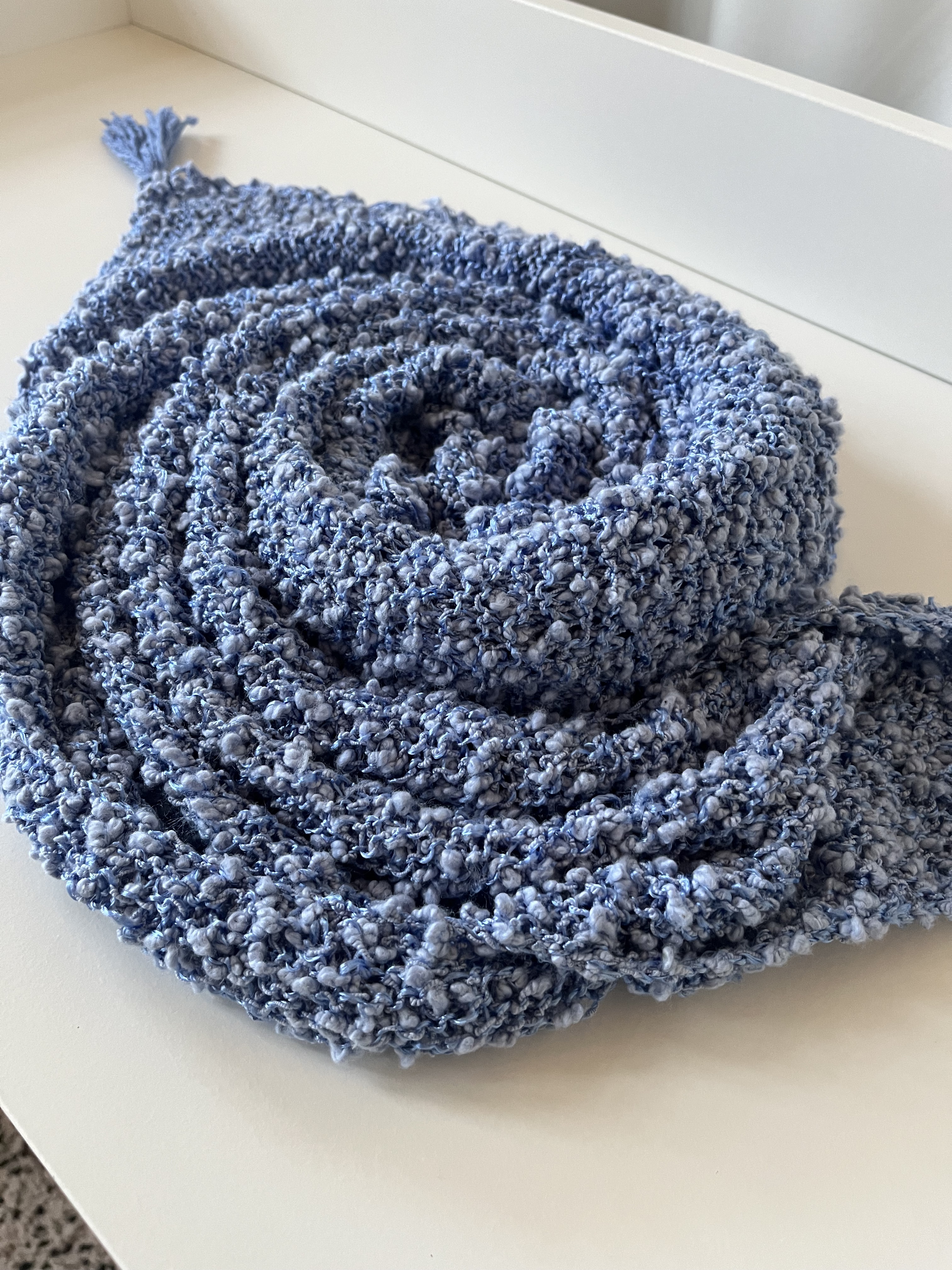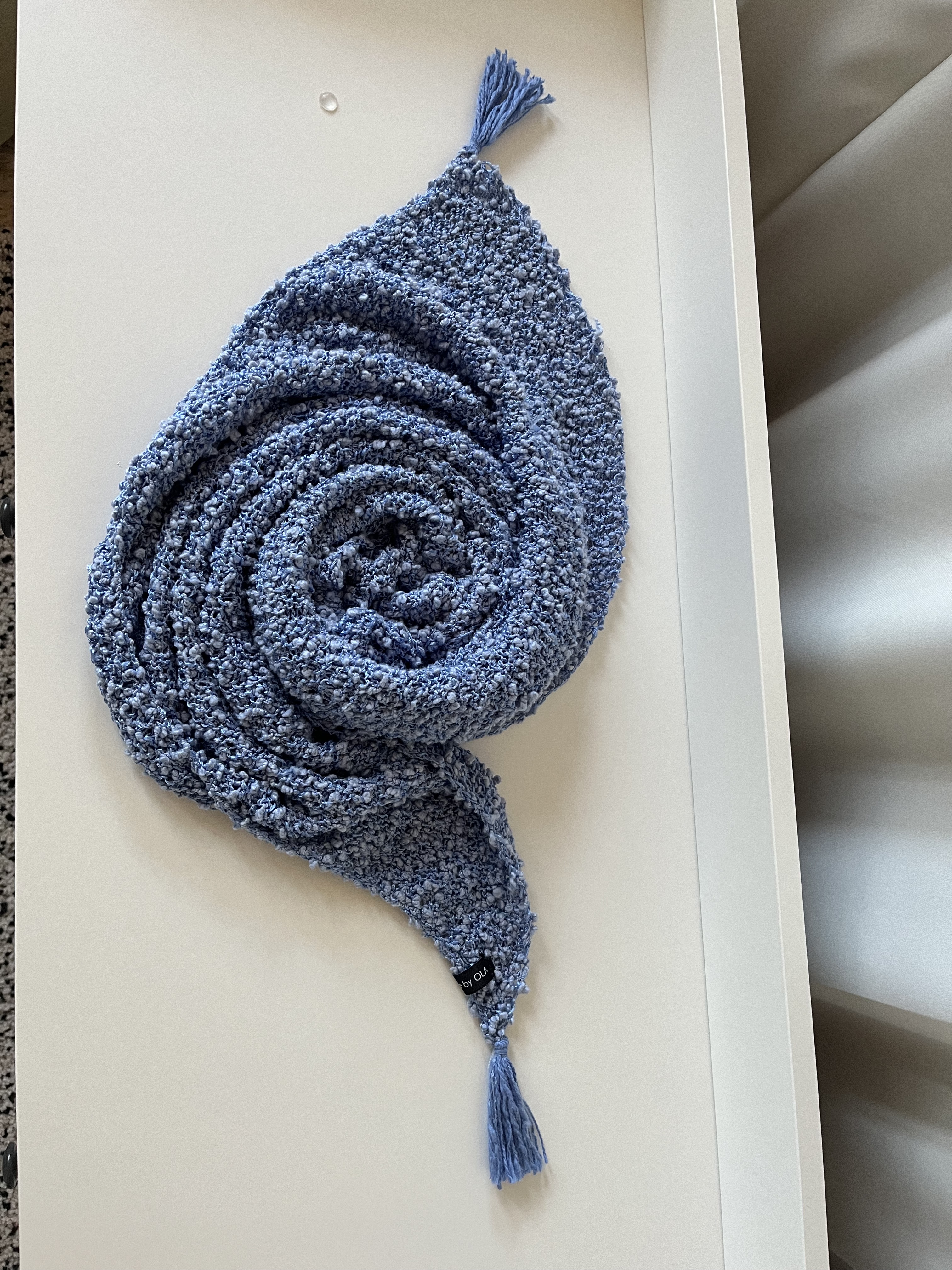 Hier habe ich aus weichem Knötchengarn ein schönes Dreieckstuch gestrickt .