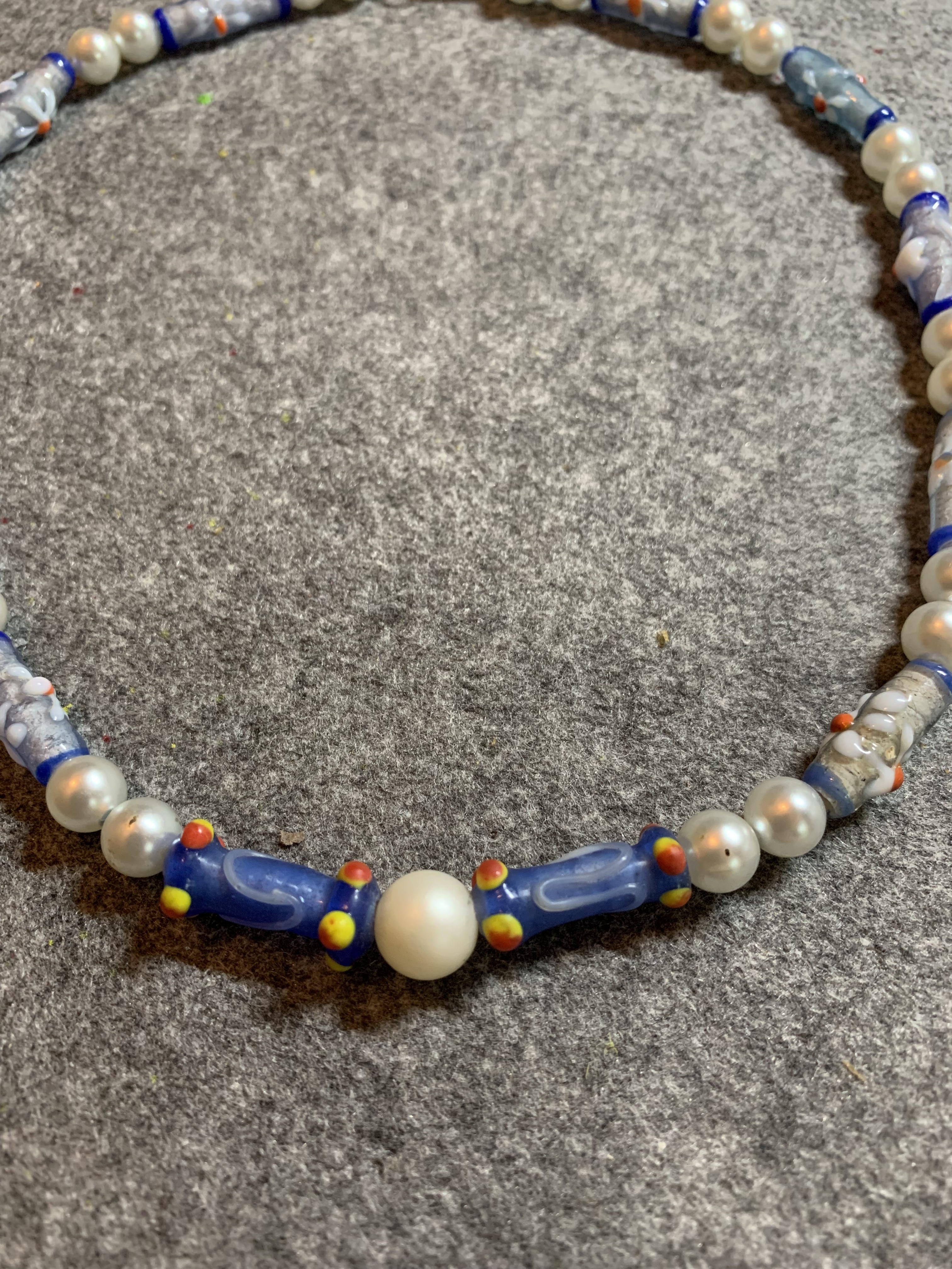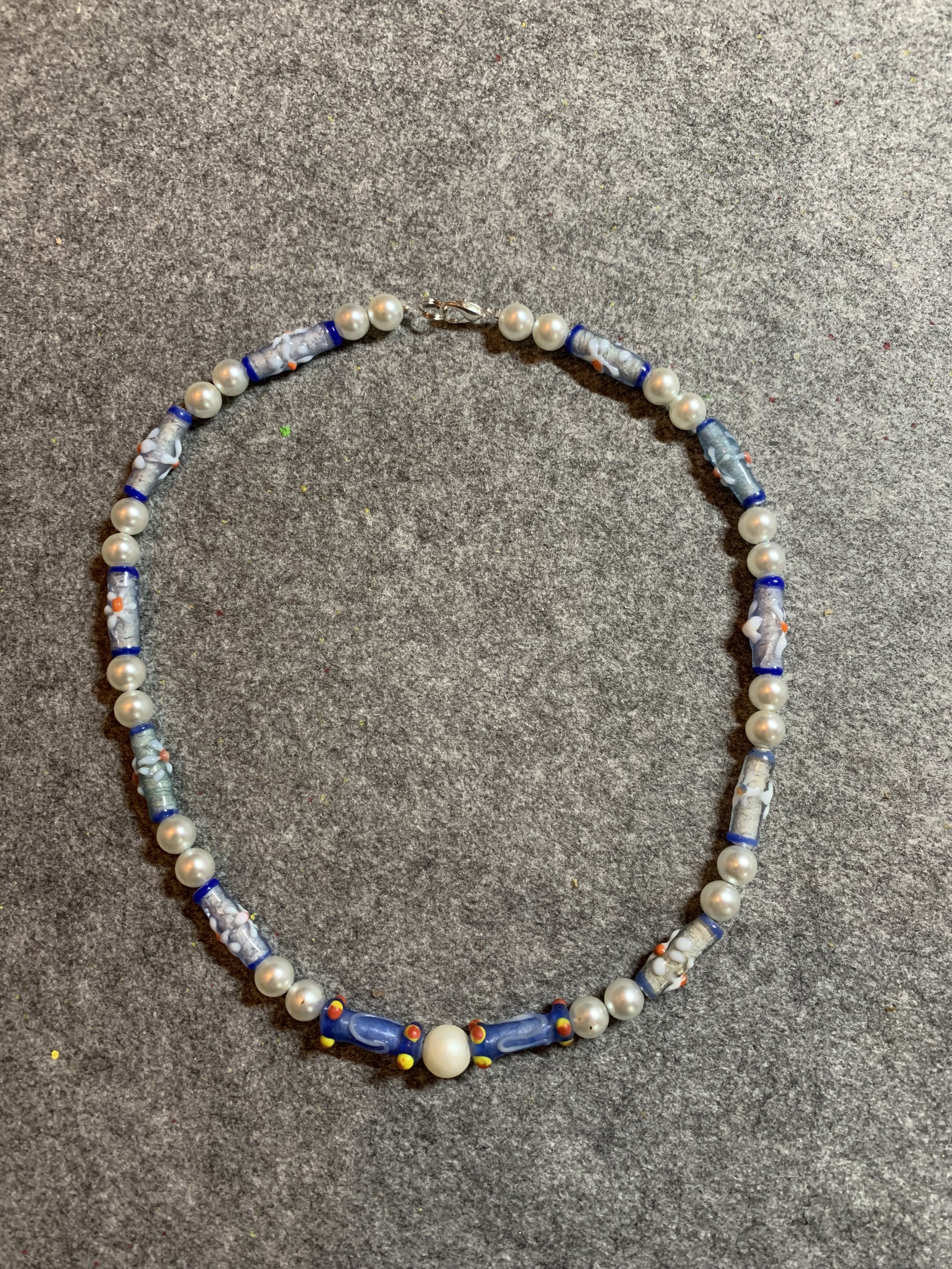 Die Halskette besteht aus blauen Glasperlen und künstlichen weißen Perlen.