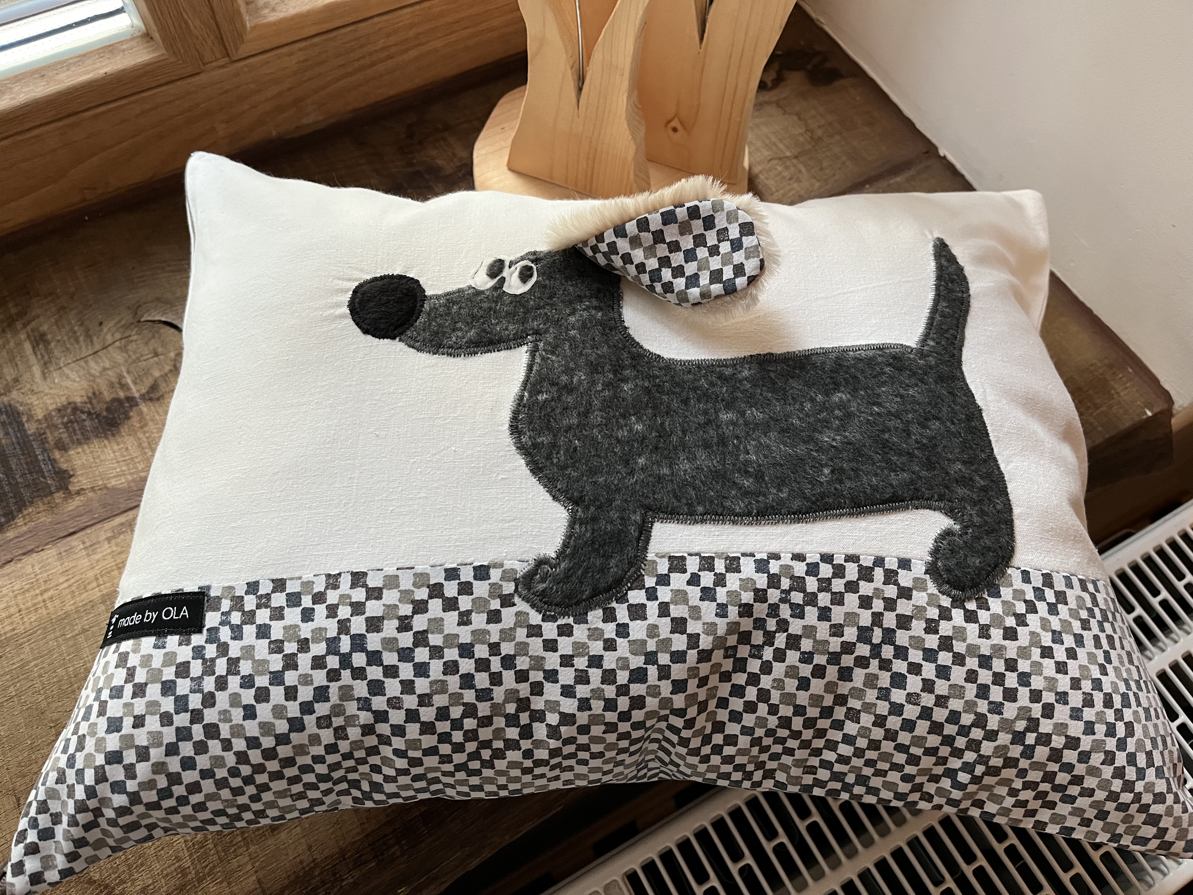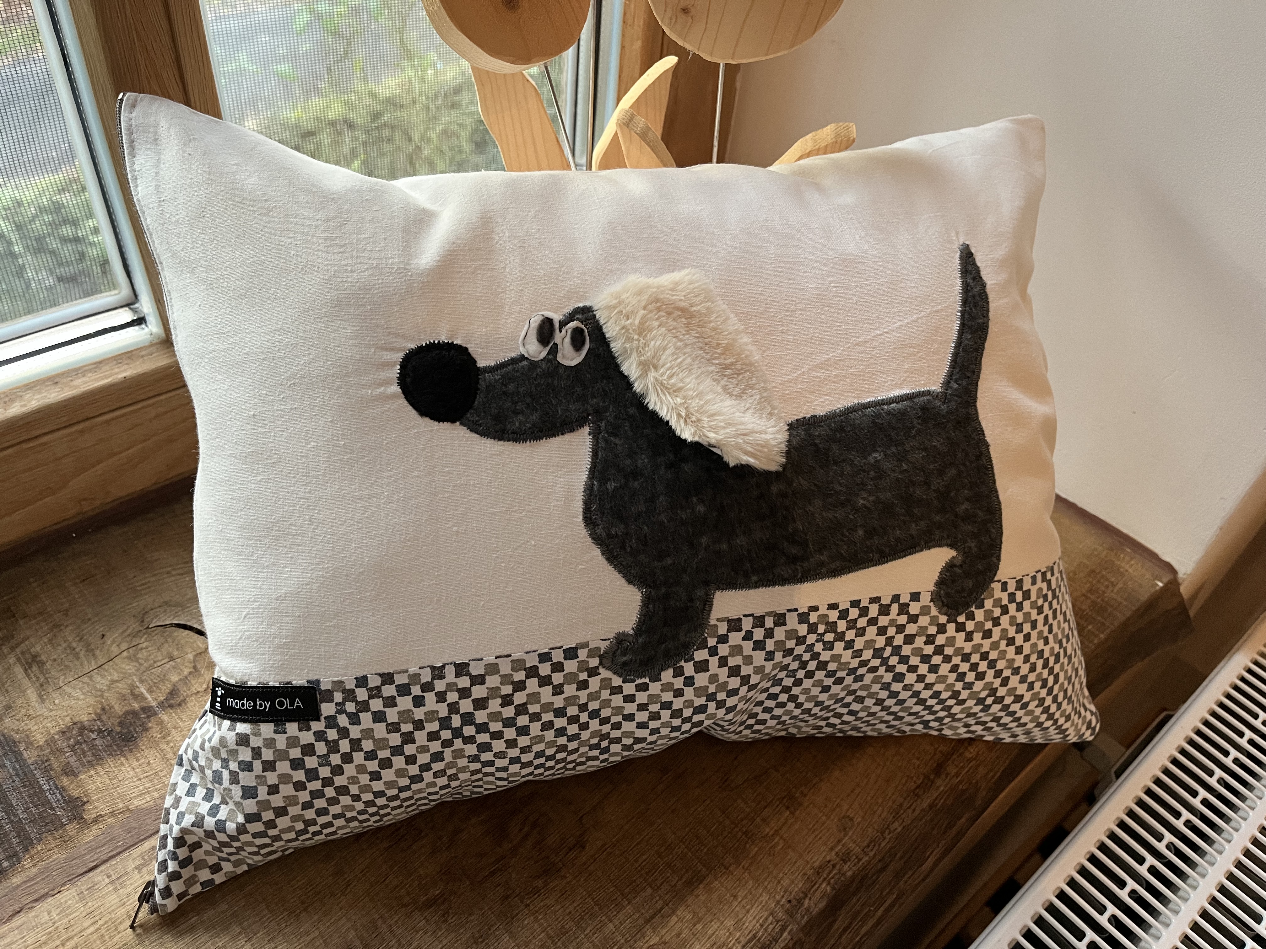 Maße Länge 50 cm Breite 35 cm Stoff 100% Baumwolle Applikation Dackelohr- 100% Polyester Reisverschluss Maschinenwäsche 30'C Kisseninnenhülle 100% Baumwolle Kissenfüllung 100% Poyester Maschinenwäsche 60'C