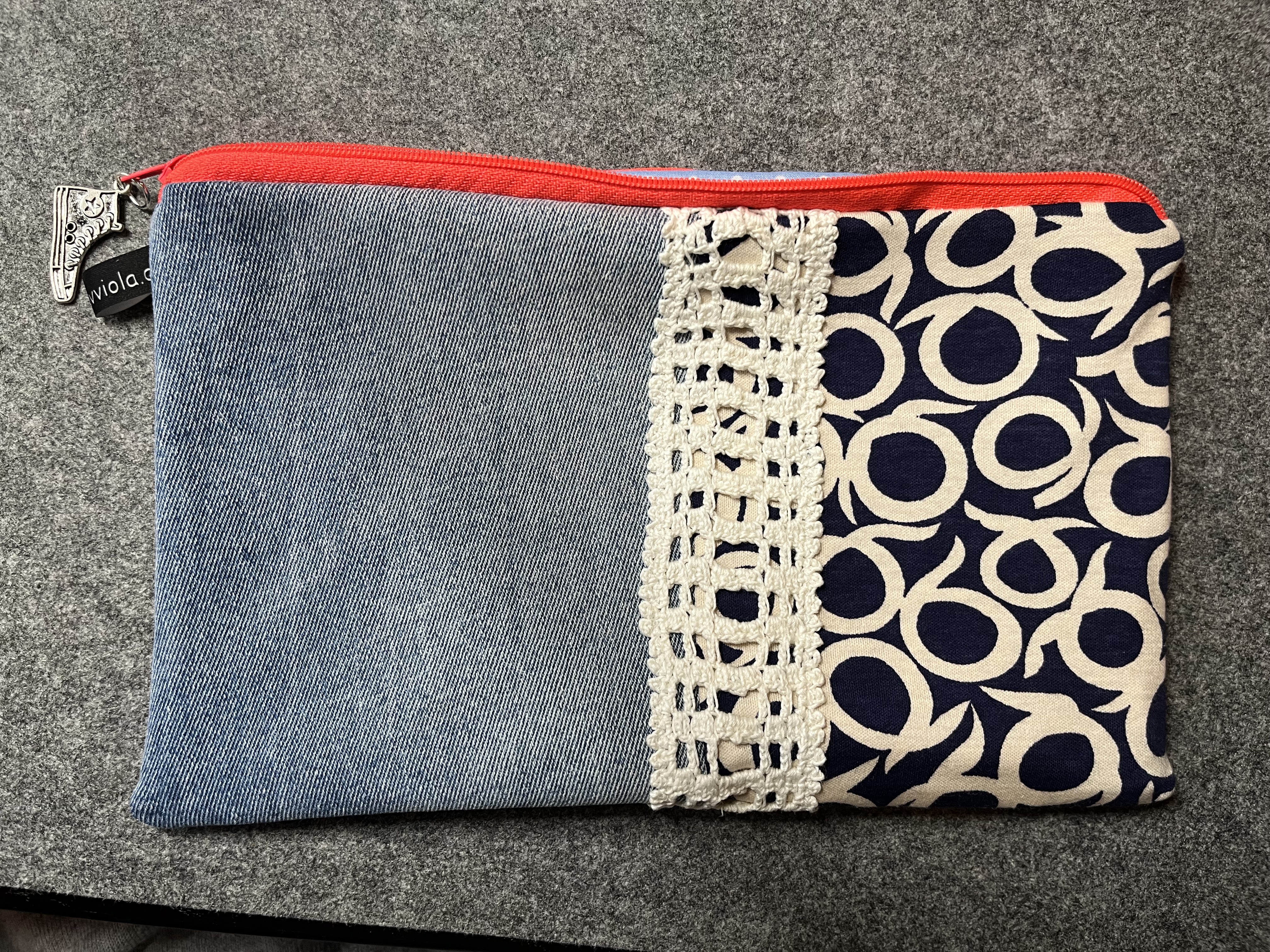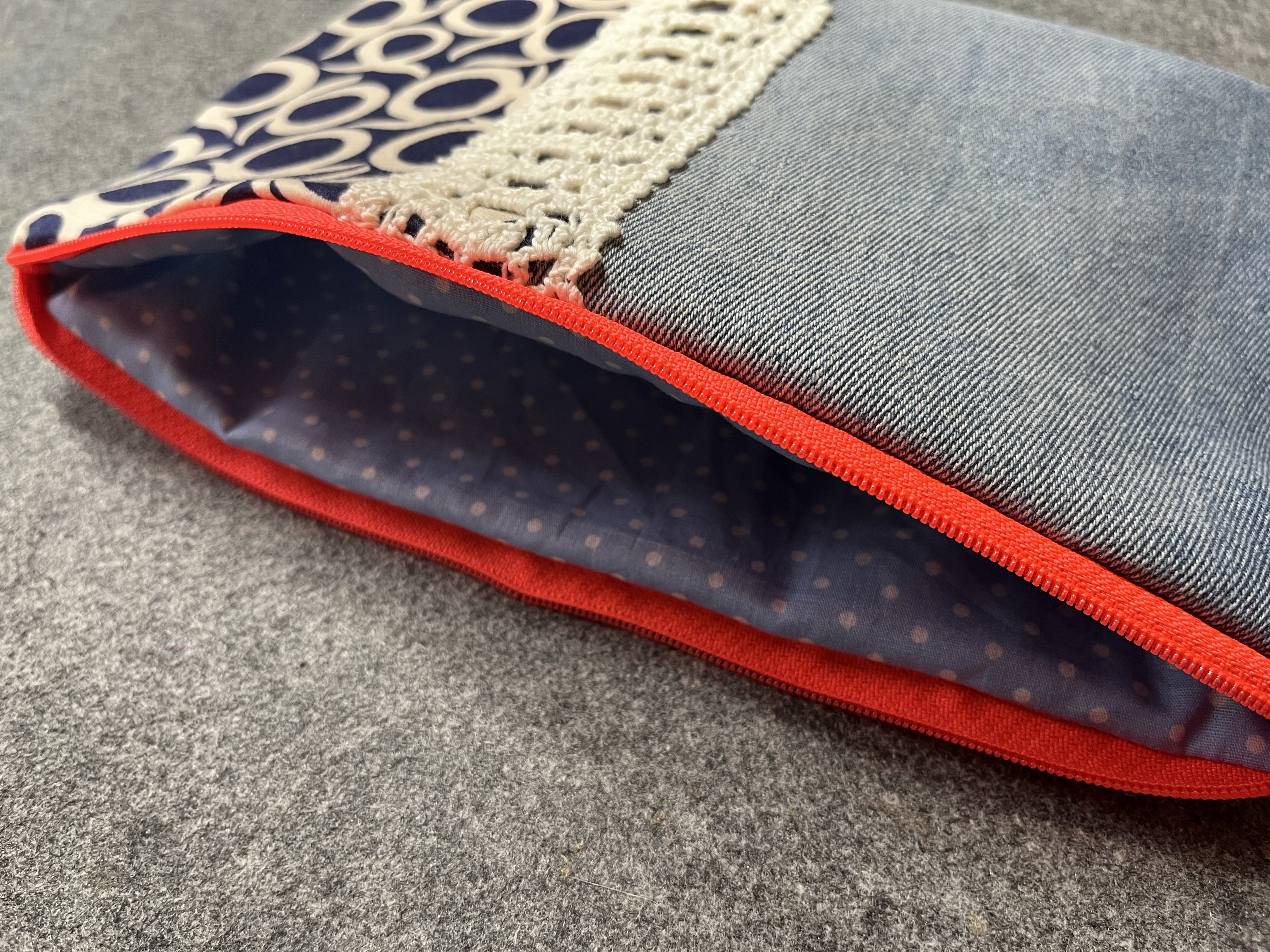 Aus Jeansresten verbunden mit handgehäkelter Spitze und weiteren Stoffresten