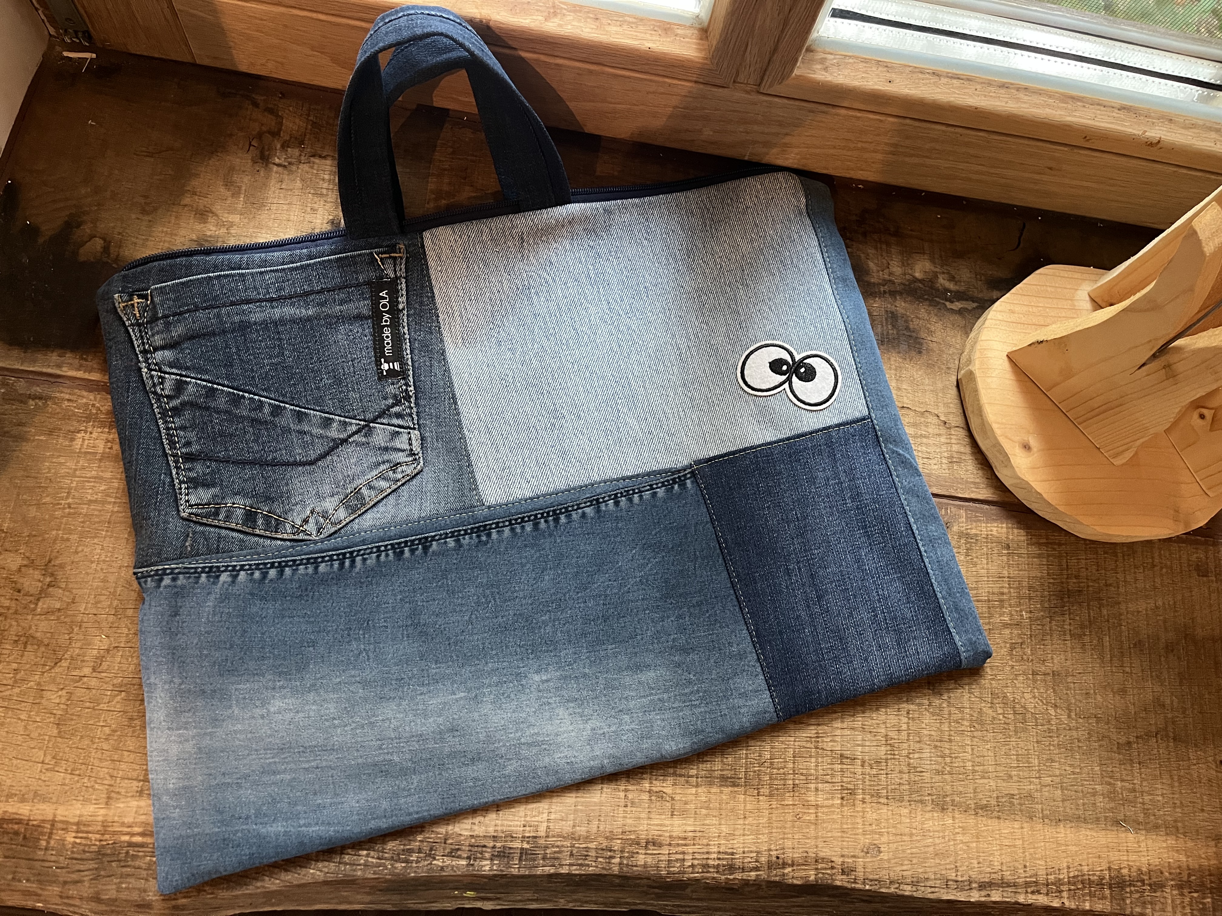 Hier habe ich aus Jeansresten Laptoptaschen genäht.