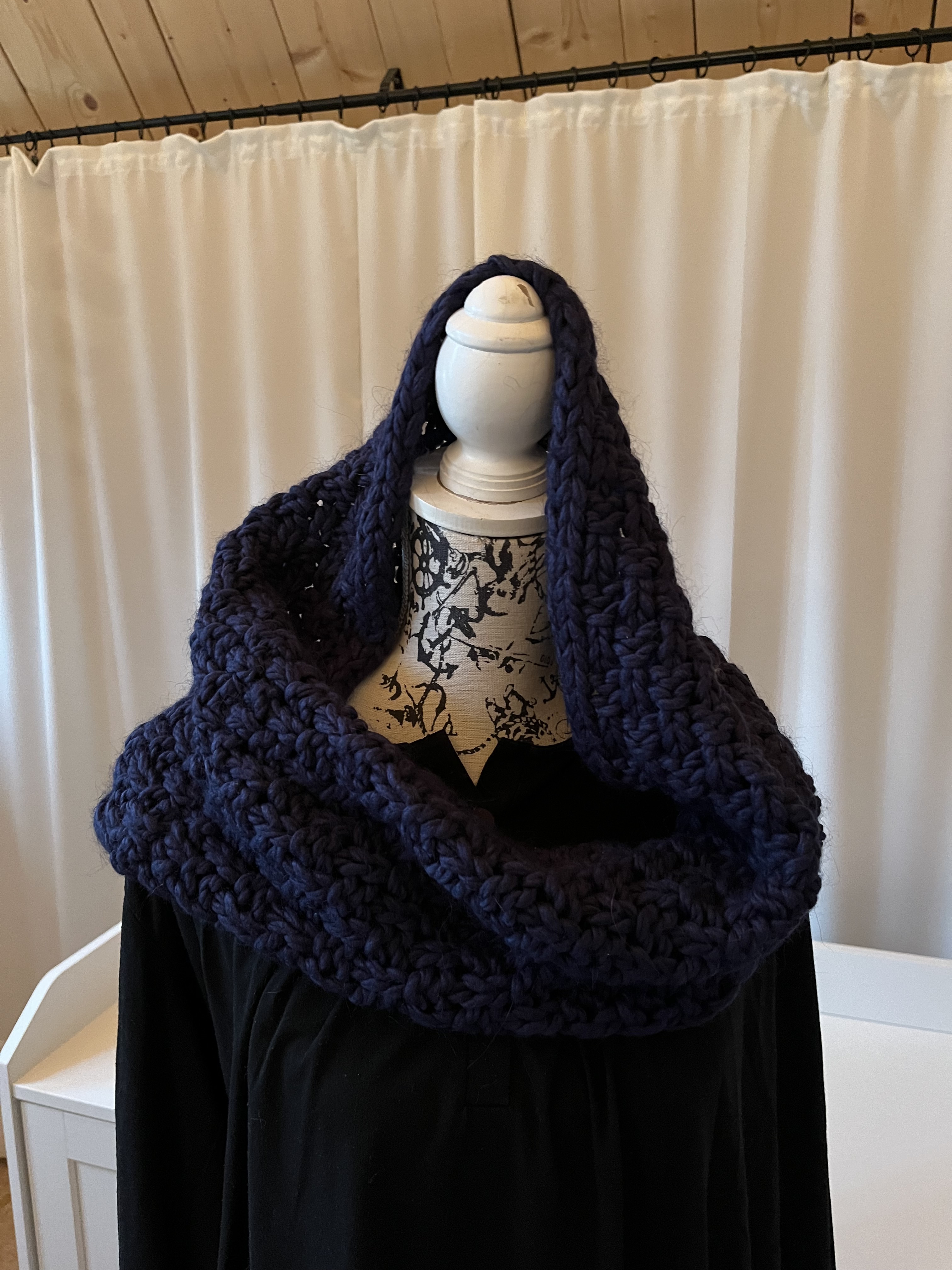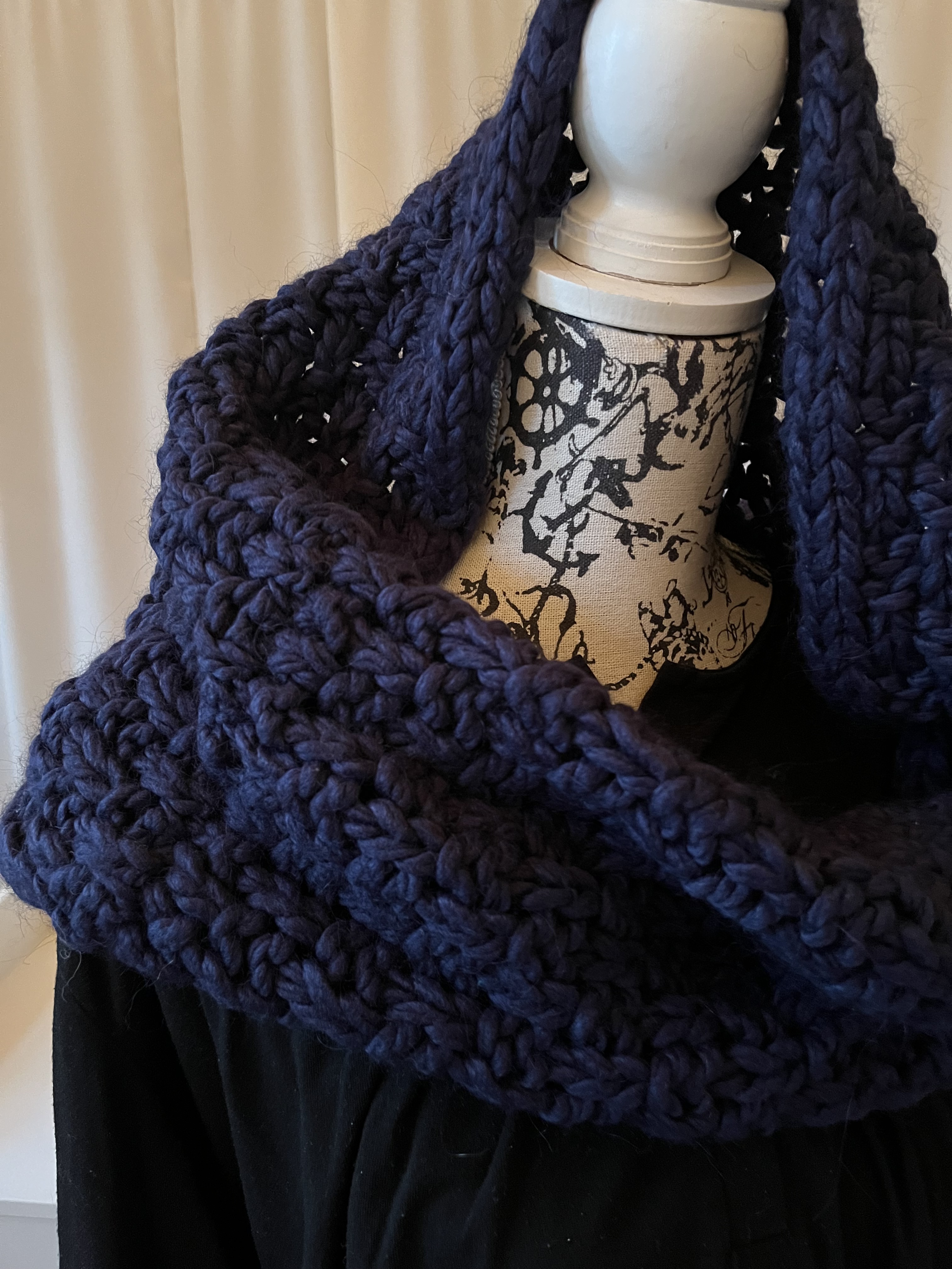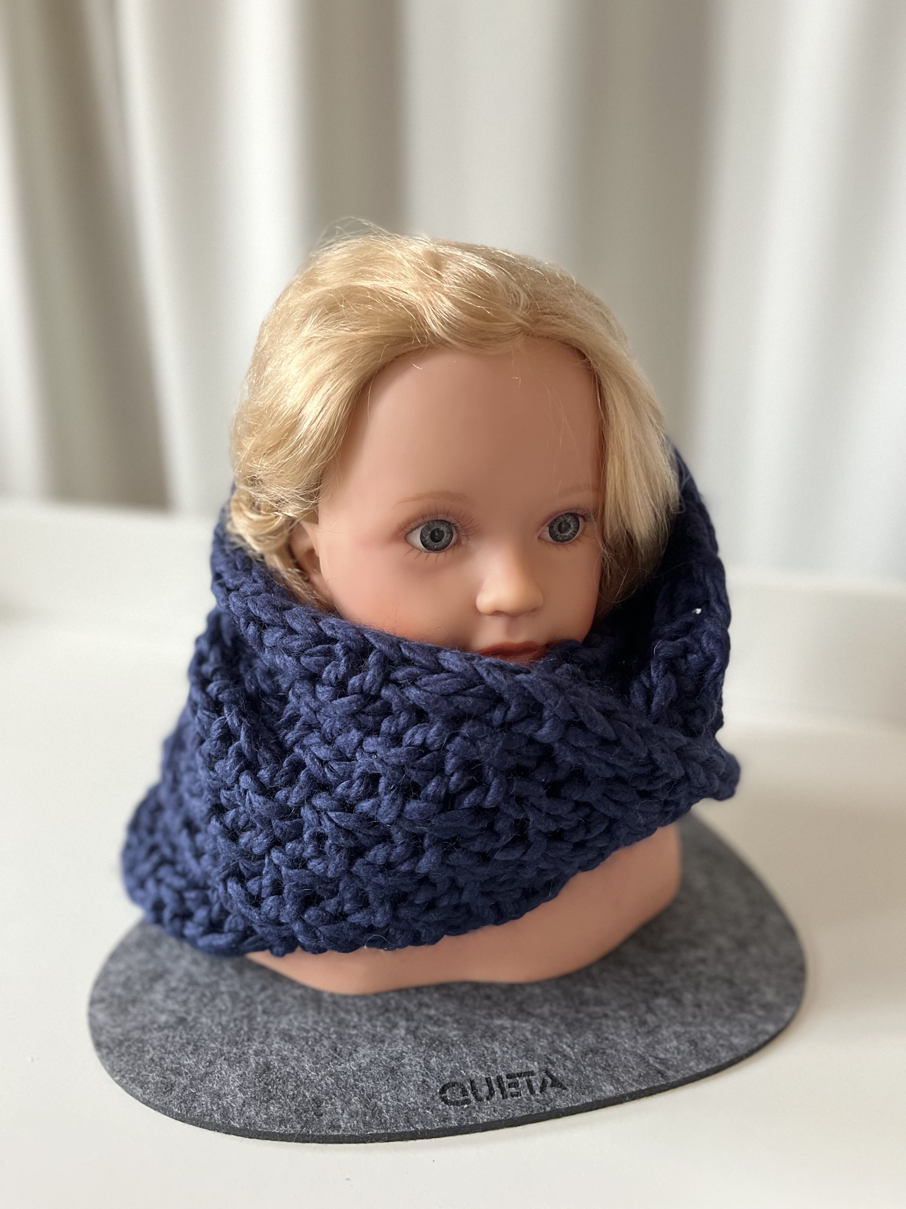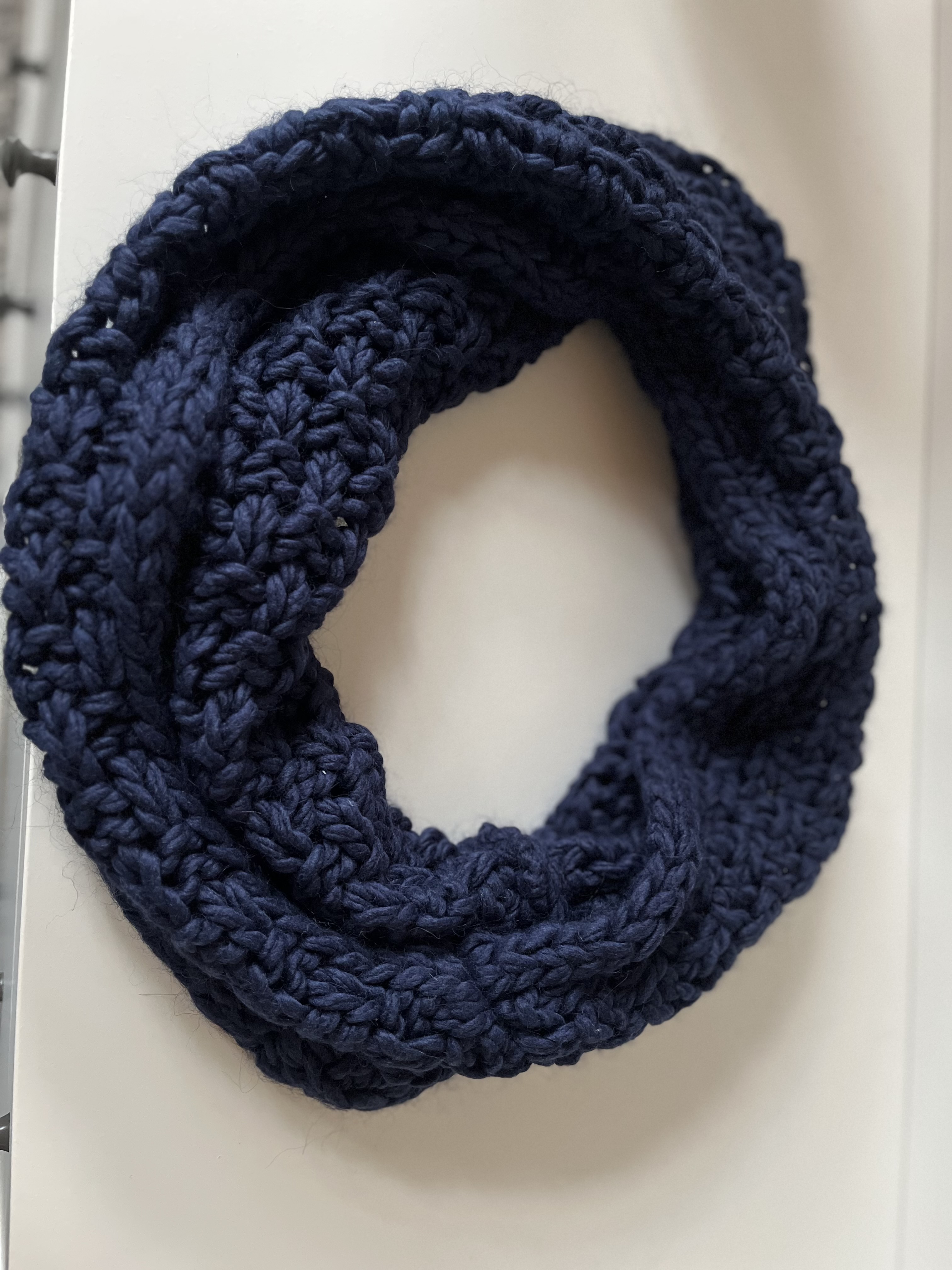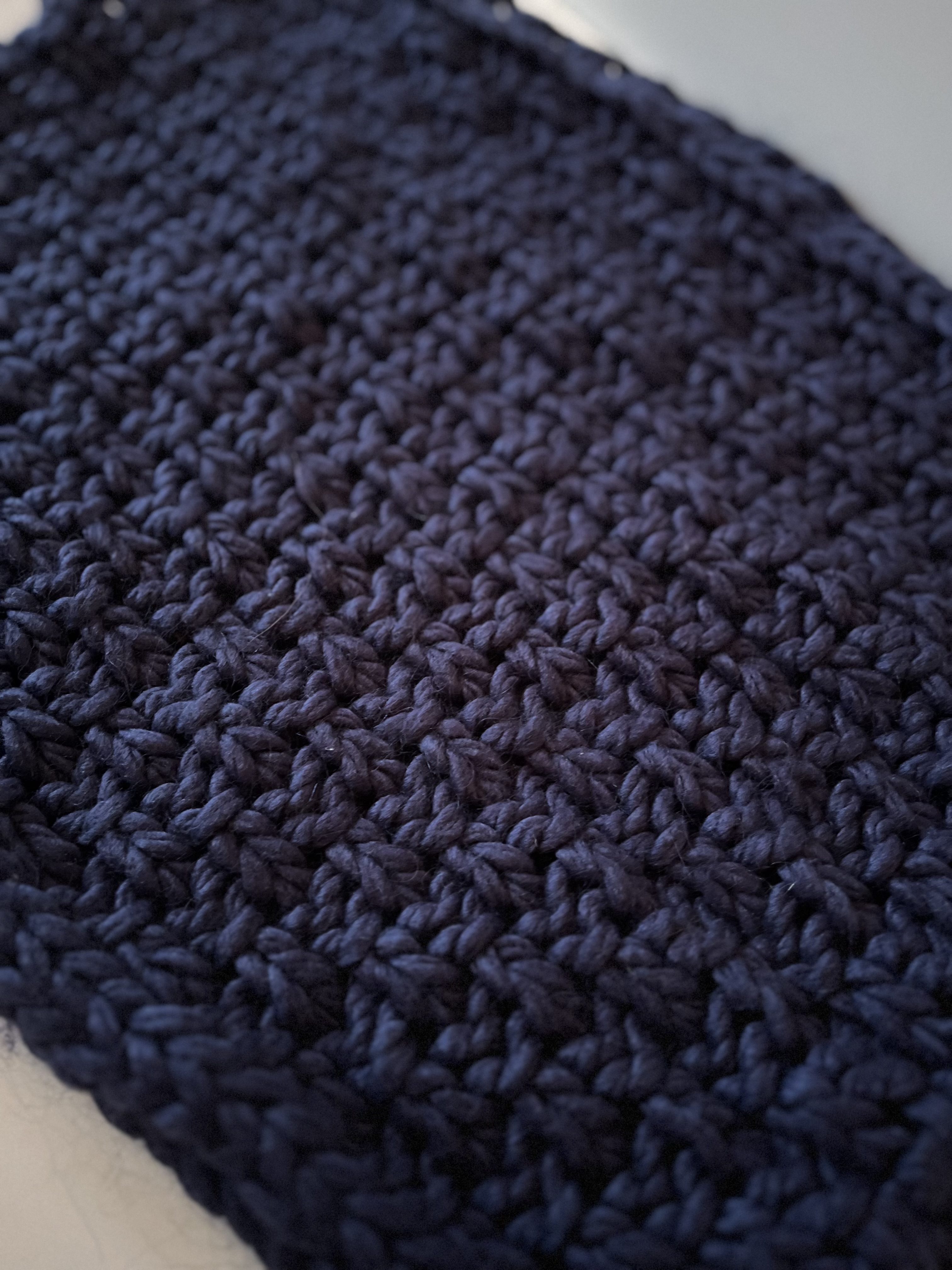 Hier habe ich dunkelblaue Wolle verstrickt.