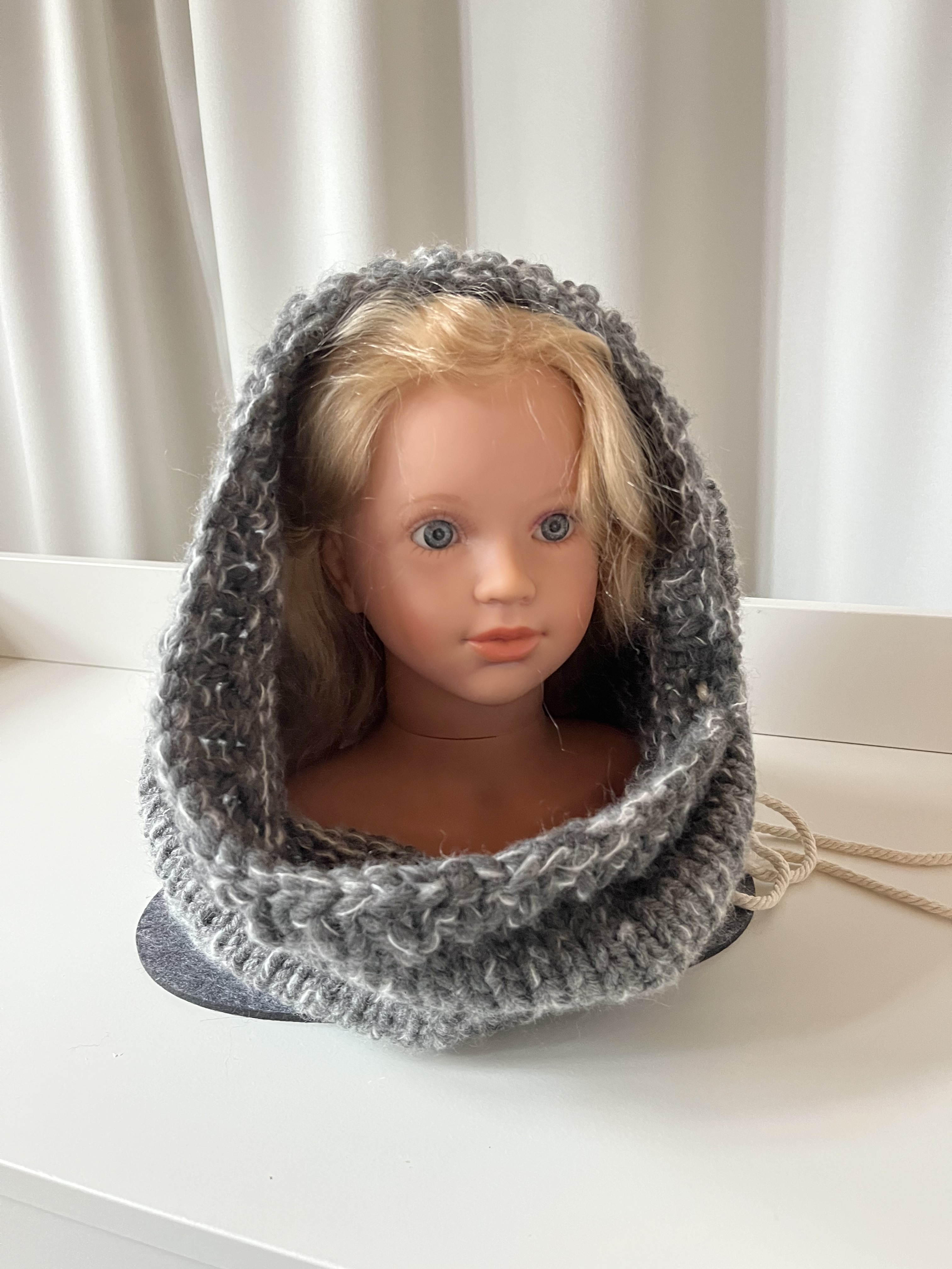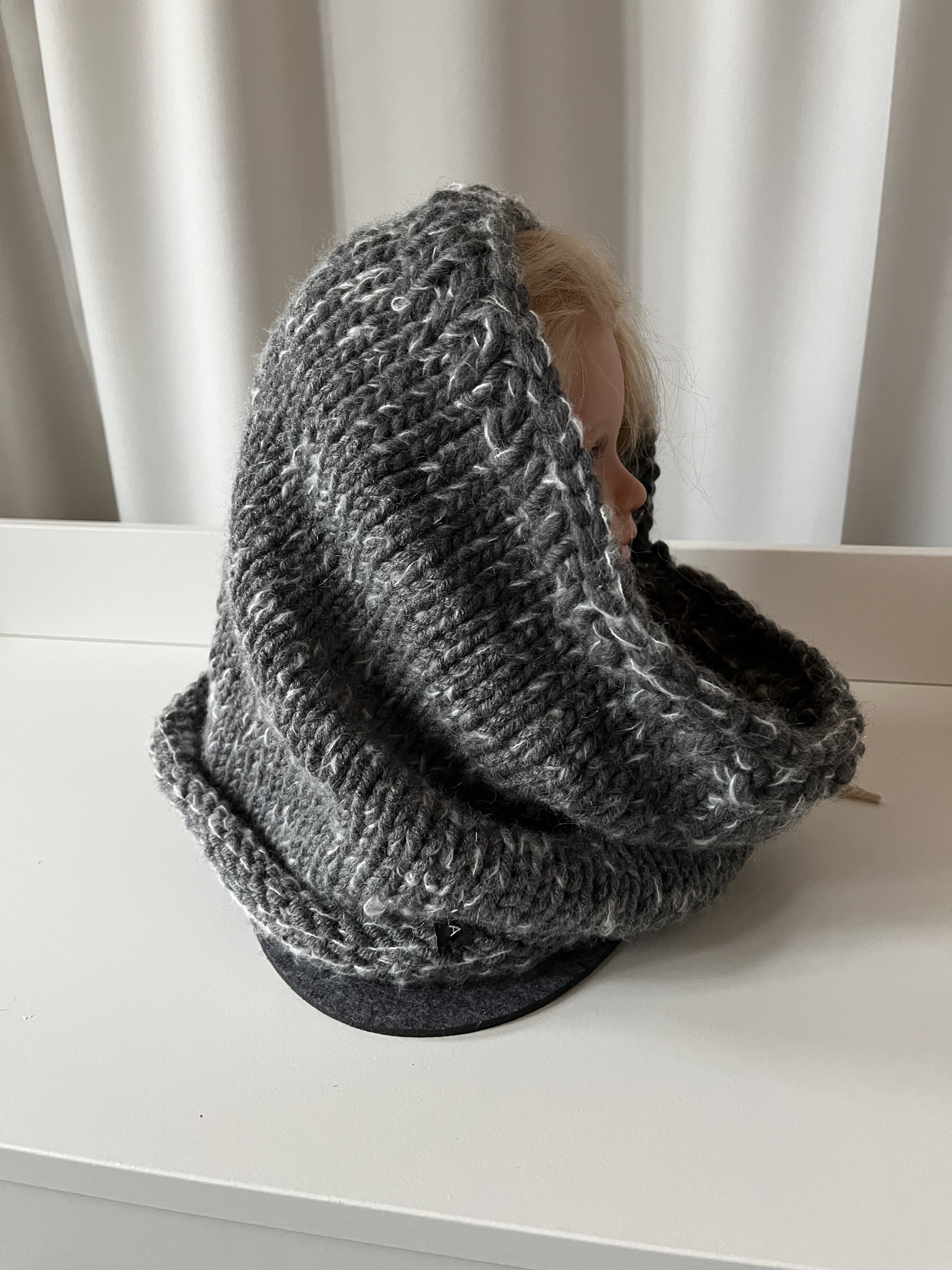 Hier habe ich grau melierte Wolle verstrickt.