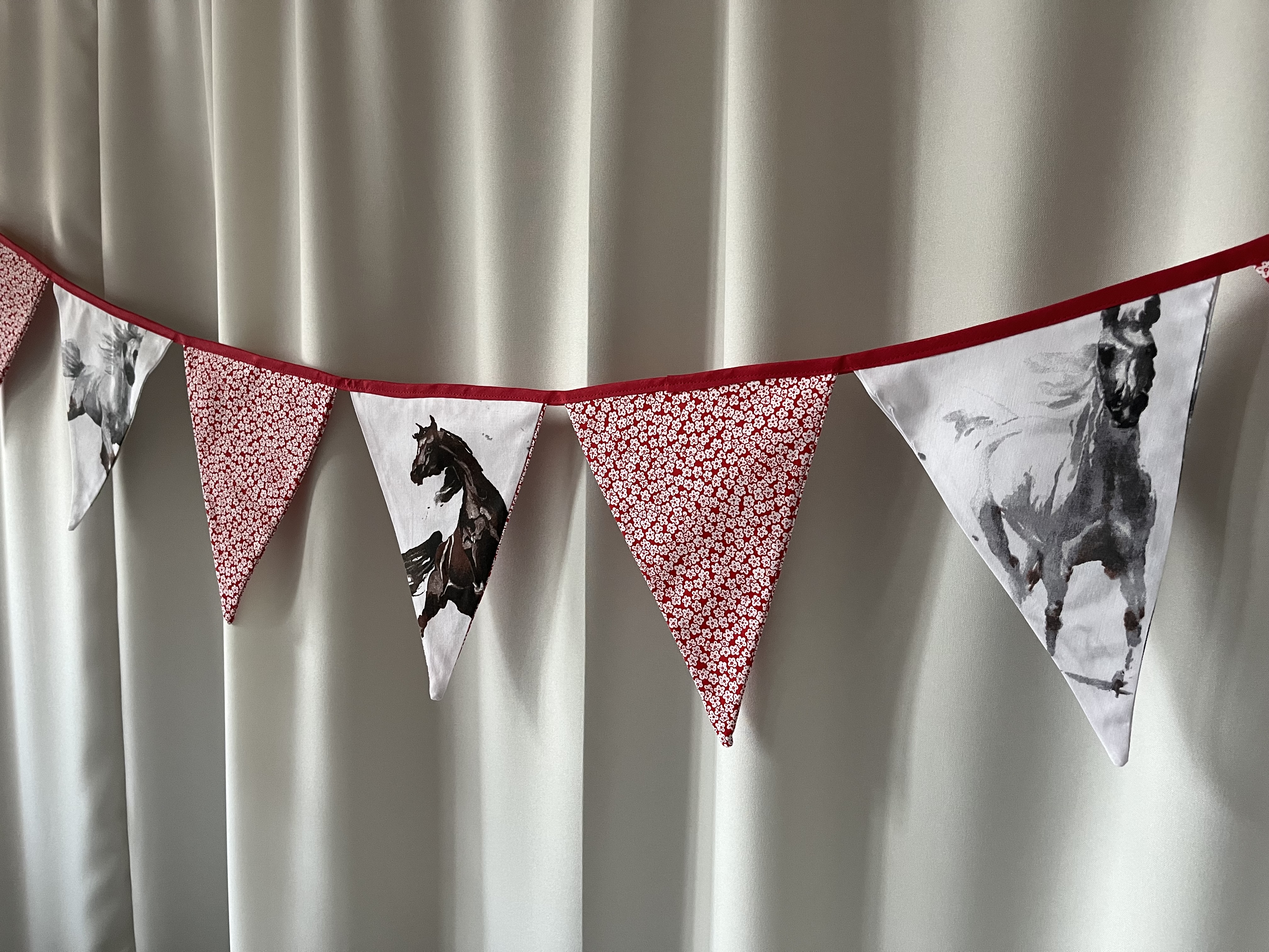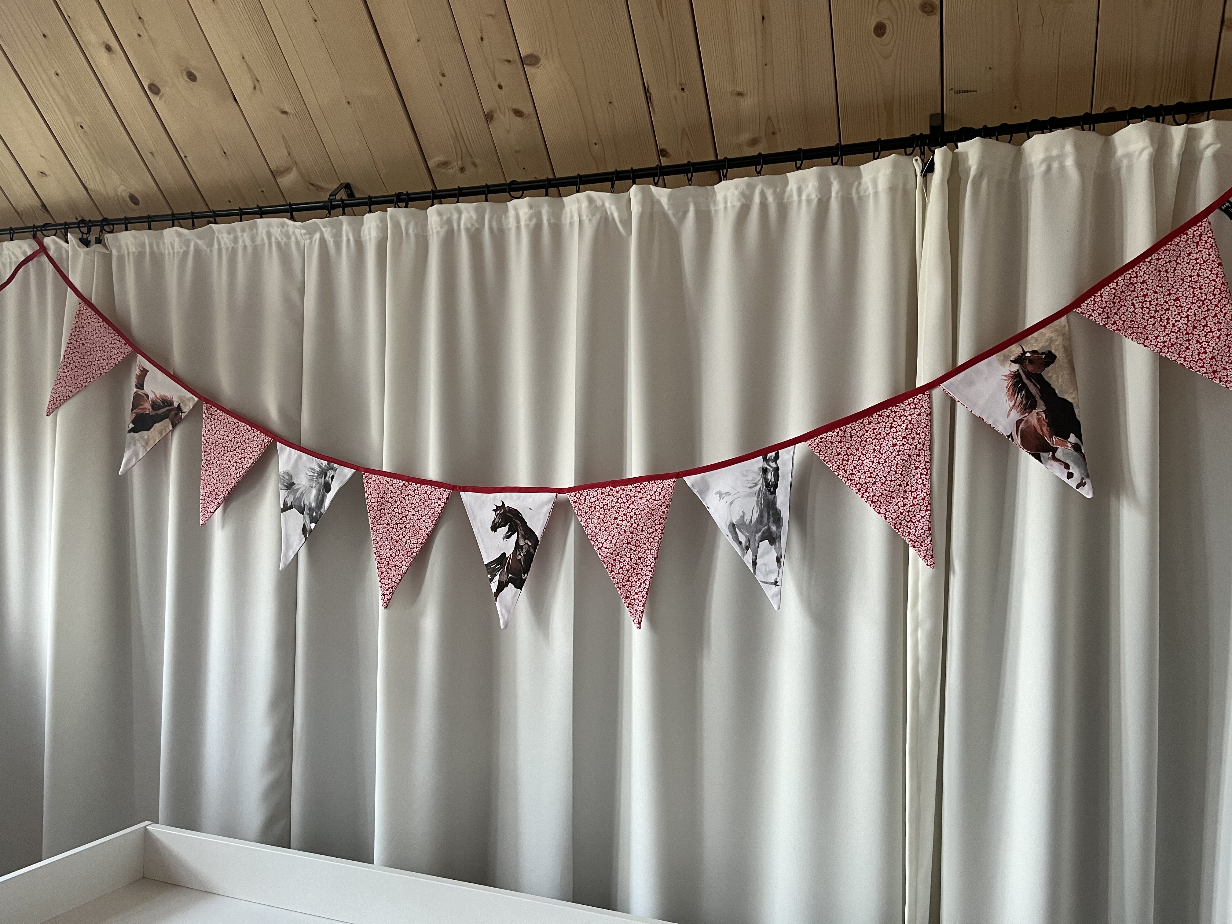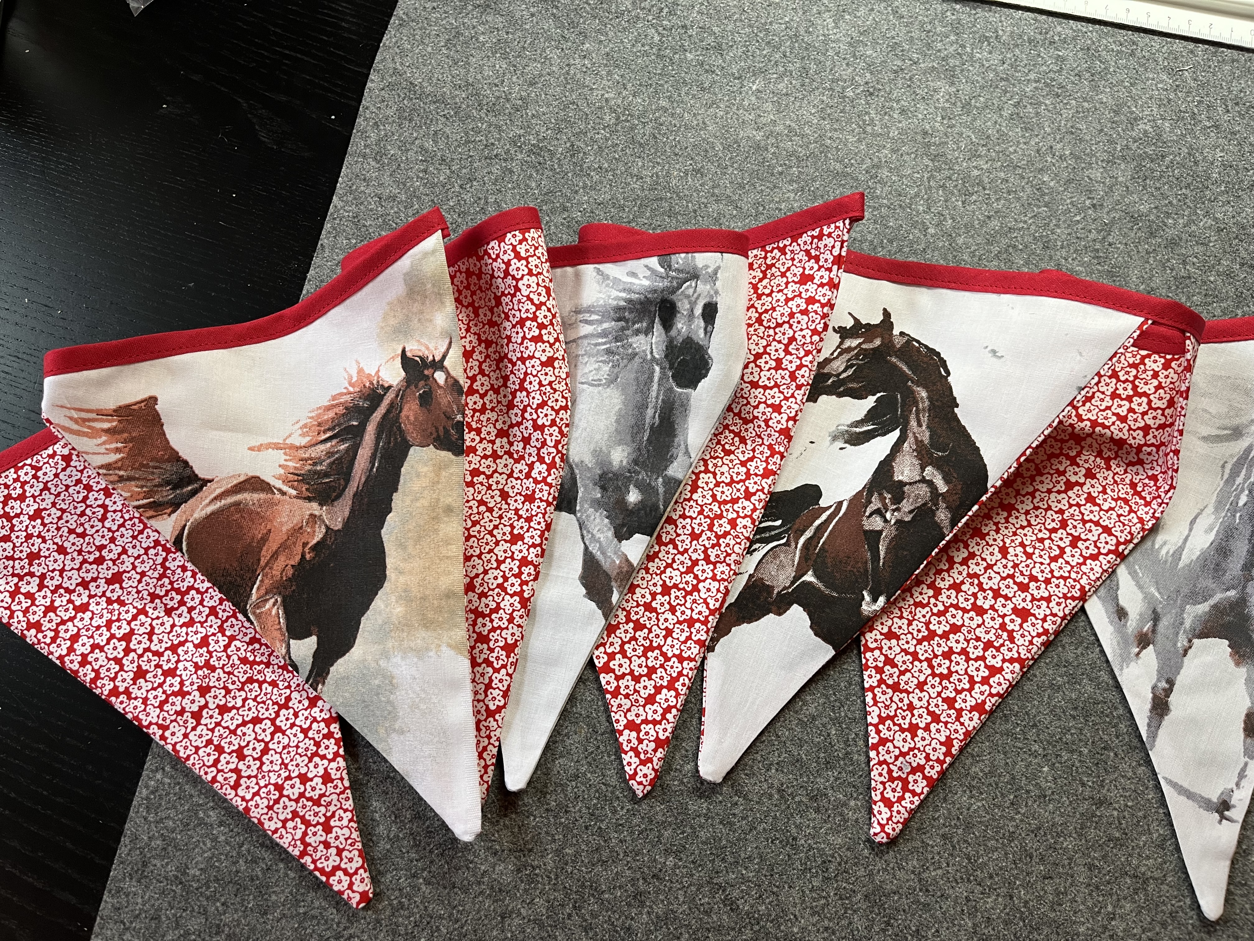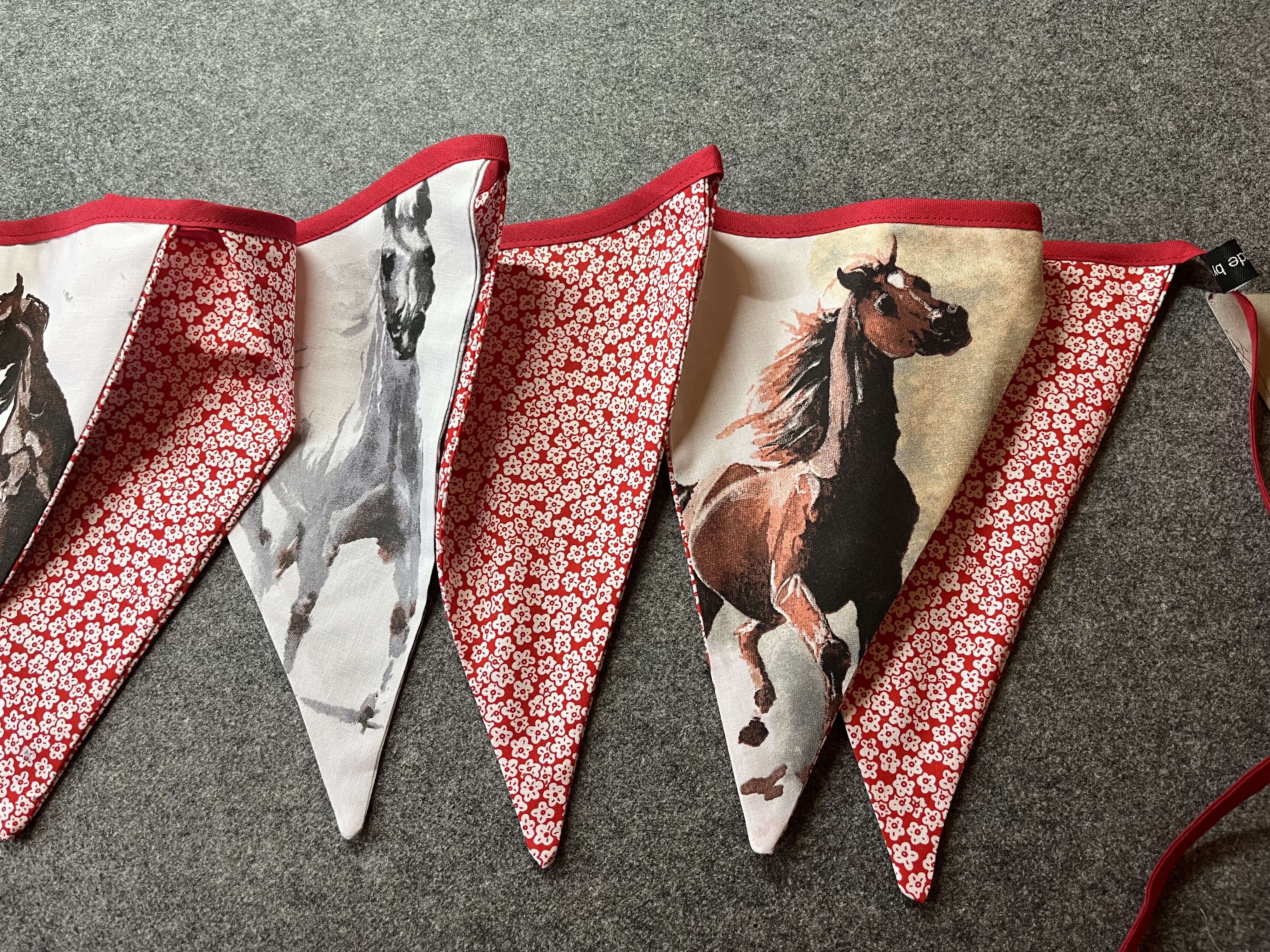 Hier habe ich aus schönen Stoffresten eine Pferdewimpelkette genäht.